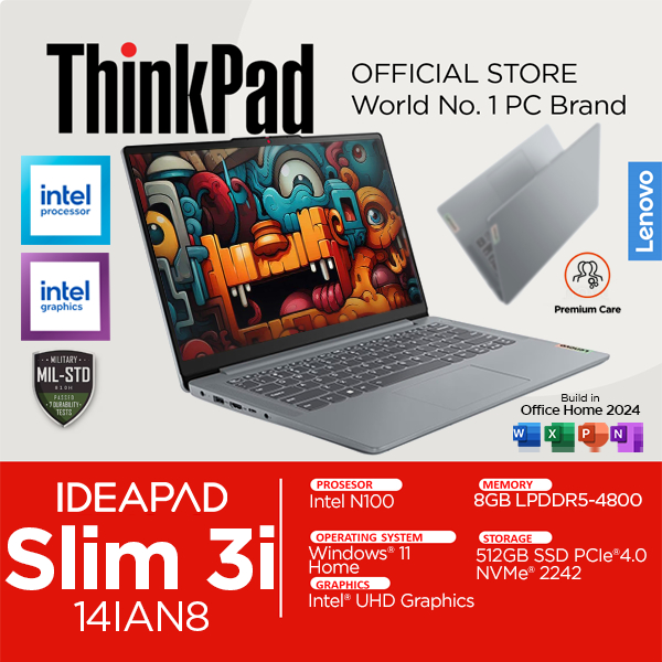 Lenovo Ideapad Slim 3i Intel N100 8GB RAM 512GB SSD Windows 11 OHS 14 inch Full HD 14IAN8 Celeron
