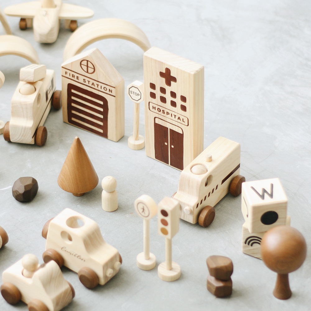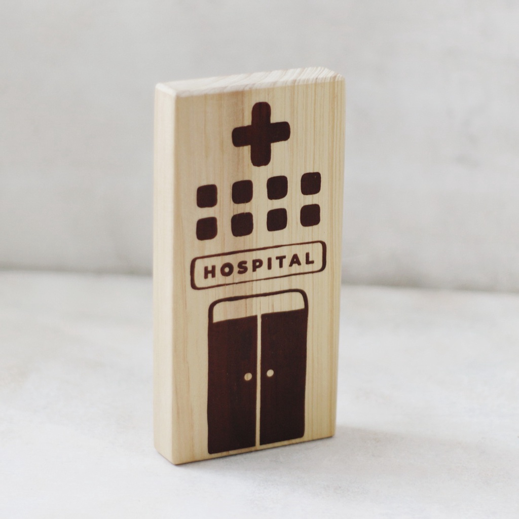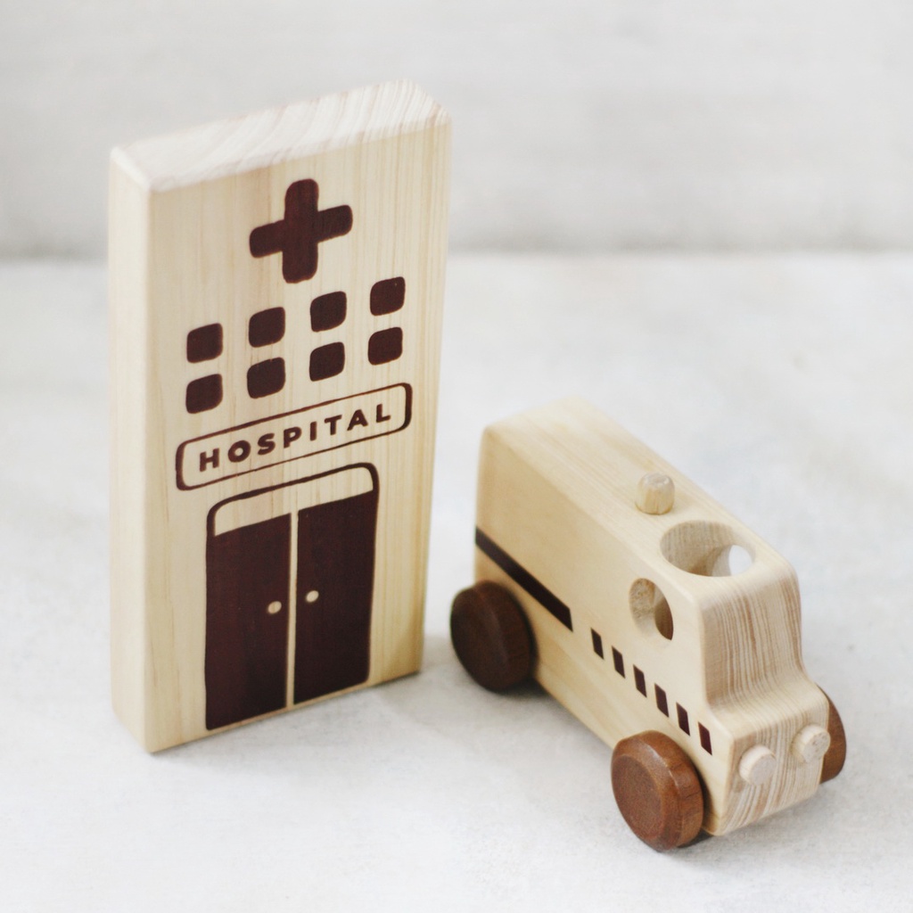 Lettering and Life Brown Ambulance & Hospital Block - Mobil Ambulance Mainan Balok Kayu Susun Mobil mobilan Mainan Edukasi Pretend Play Wooden Toy (Little Town Collection)