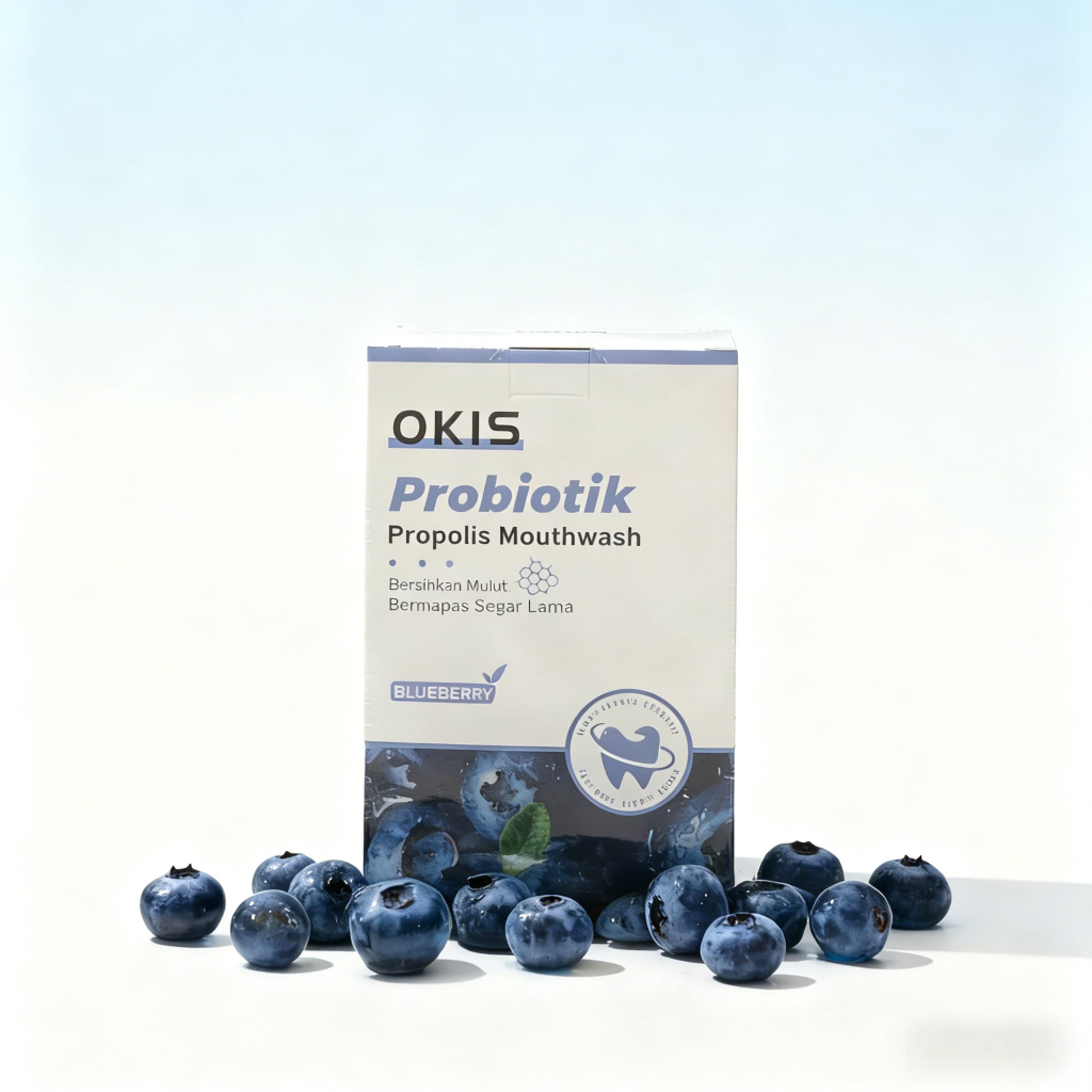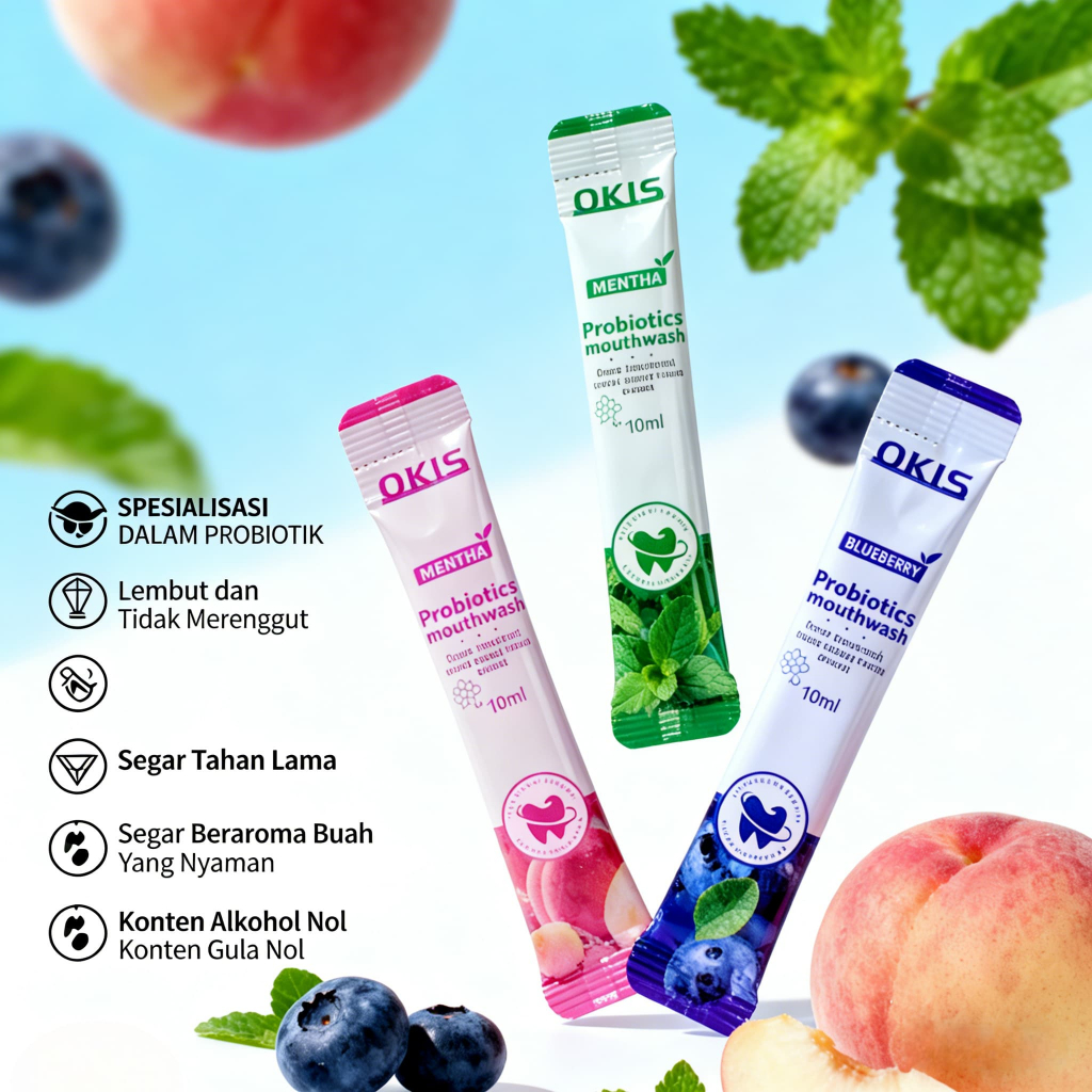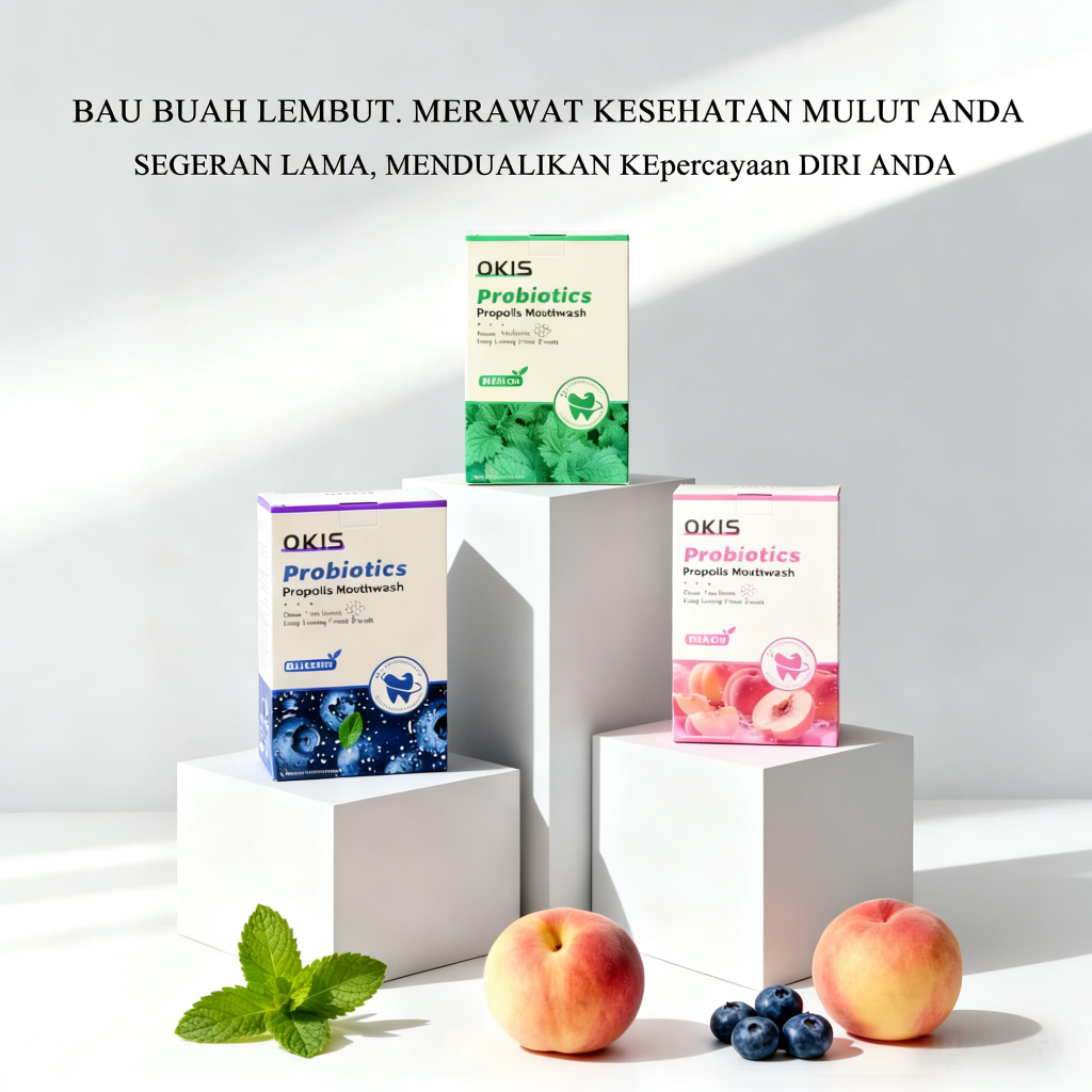 OKIS Obat Kumur Probiotik dan Propolis 20 Sachet per Kotak Menyegarkan Nafas Perawatan Mulut Tiga Rasa: Blueberry, Persik, Mint