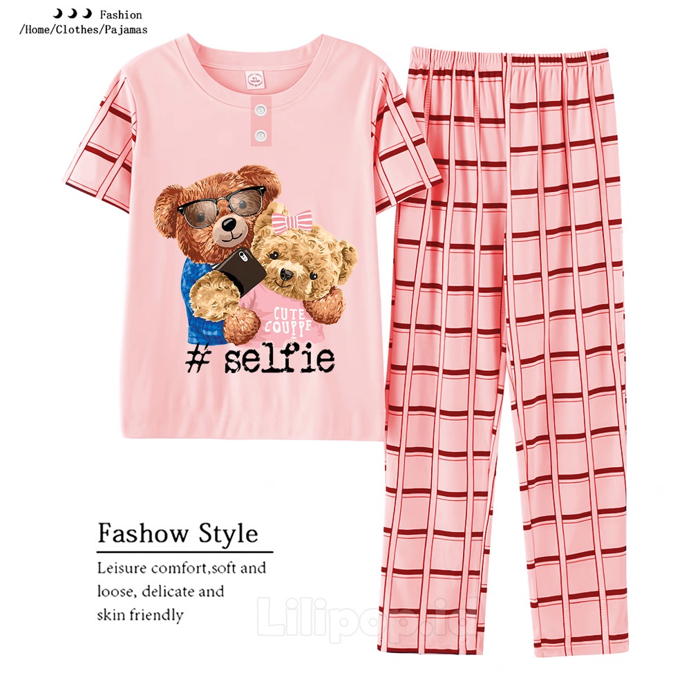 Lilipop.id Baju Tidur Wanita CP Teddy bear Selfie Setelan Piyama BabyDoll Kaos Celana Panjang