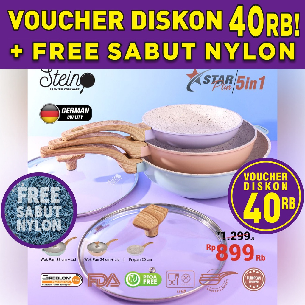 (FREE STEIN TONGS) Stein Steincookware Star Pan Starpan 5 in 1 / Stackable Floating Pan Wok 28cm + tutup - Wok 24 cm + tutup - Frypan 20 cm