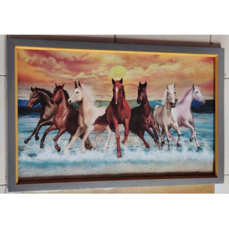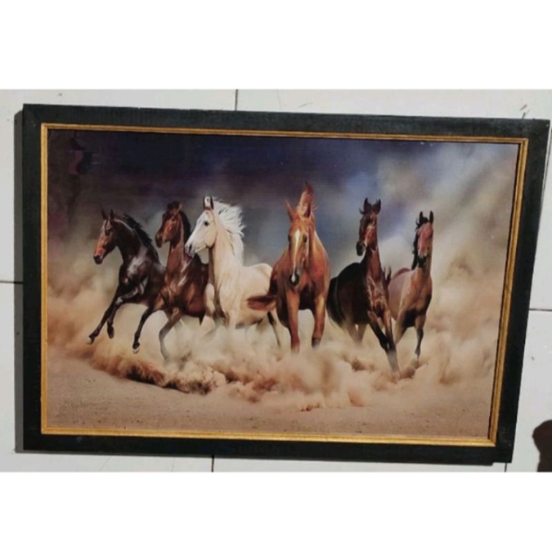 Lukisan cetak murah gambar kuda lari plus bingkai ukuran 65x45
