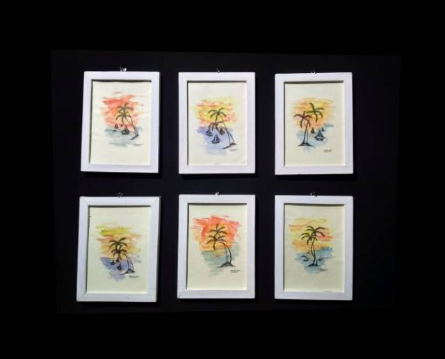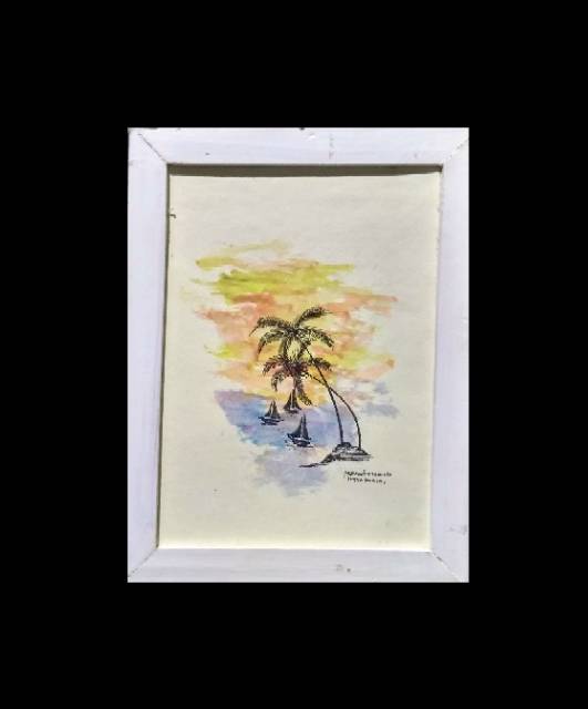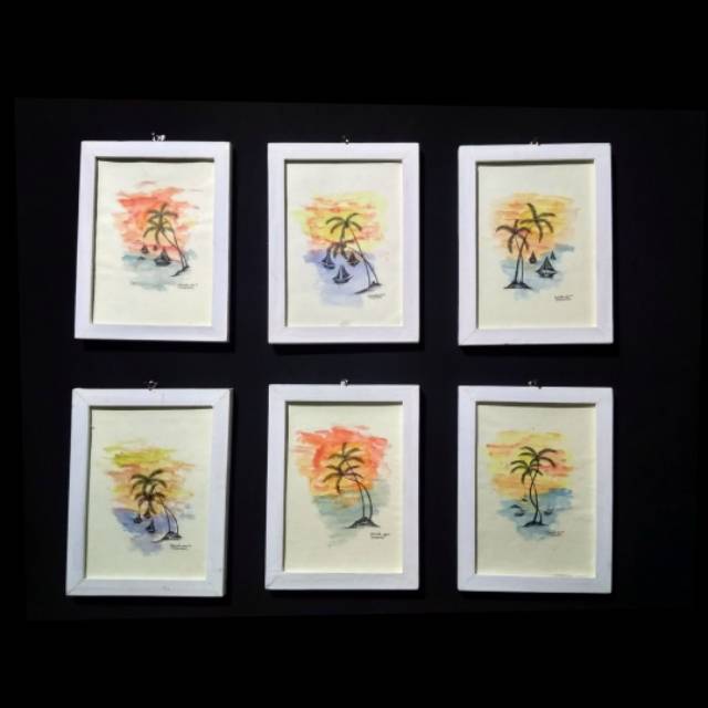 Lukisan watercolor cat air dekorasi hiasan dinding senja di pantai