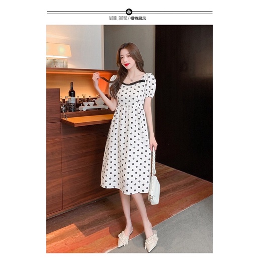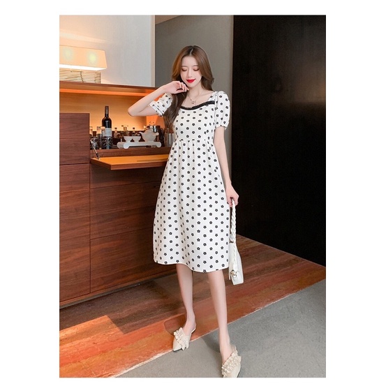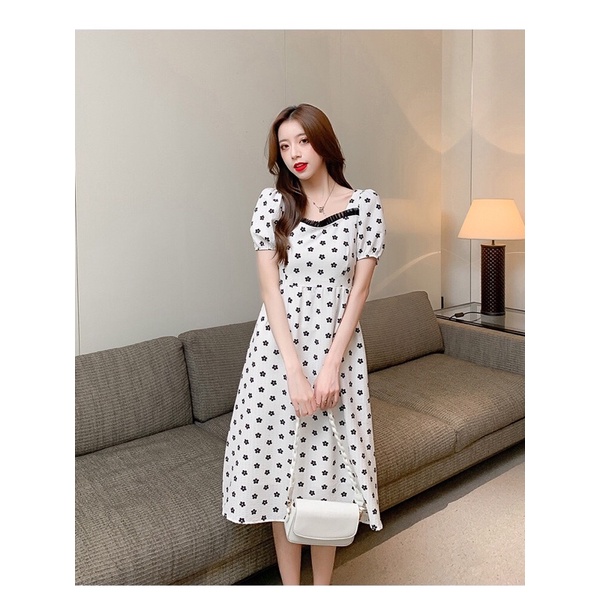 LuvHanger Dress Bunga Kecil Motif Hitam Bagian Leher Lengan Pendek Midi Dress Cantik Dress Kasual / Dress Wanita / Dress Korea
