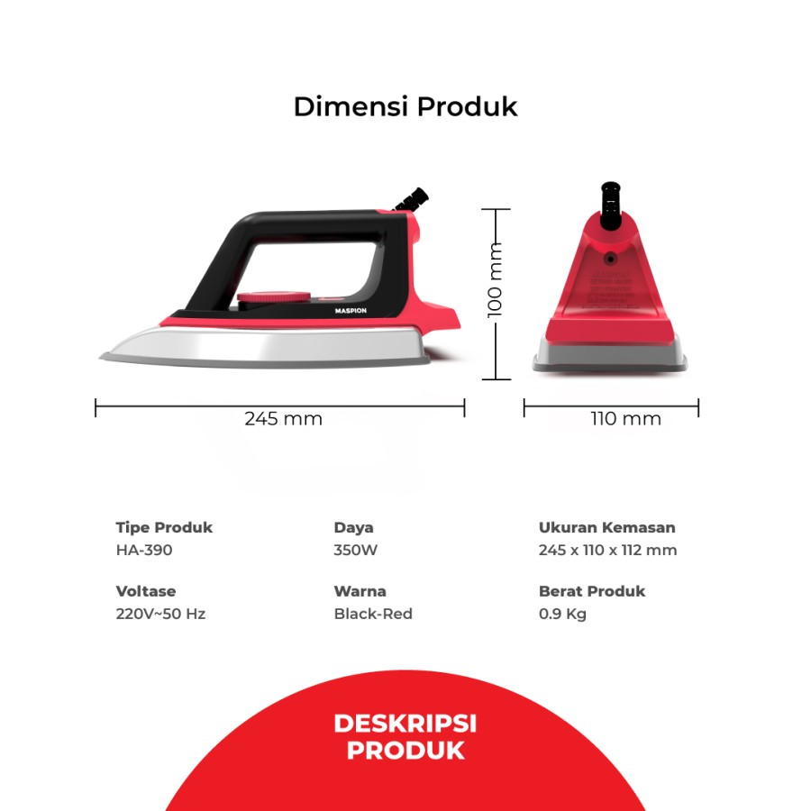 MASPION SETRIKA HA 390 AUTOMATIC IRON/HA390/HA-390/SETRIKA ANTI LENGKET/SETRIKA MASPION BODY STAINLESS/SETRIKA LISTRIK ORIGINAL MASPION/GARANSI RESMI