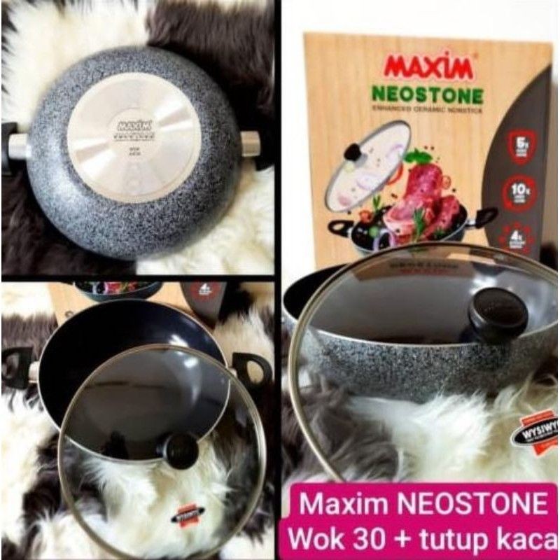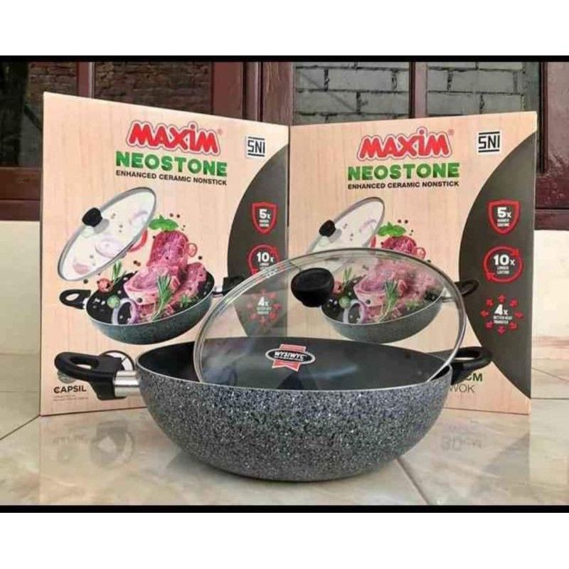 MAXIM CERAMIC WOK 30 CM + TUTUP - MAXIM NEOSTONE DEEP WOK PAN STIR FRY 30 CM - TEFLON GRANITE MARBLE