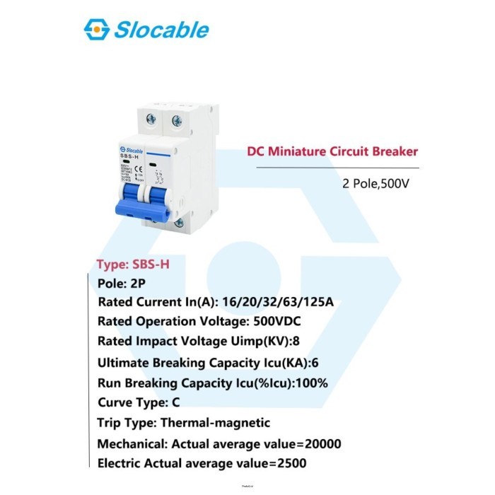 MCB DC 2 Pole 16A 20A 32A 63A 125A 500V SBS-H Slocable MCB DC 2P