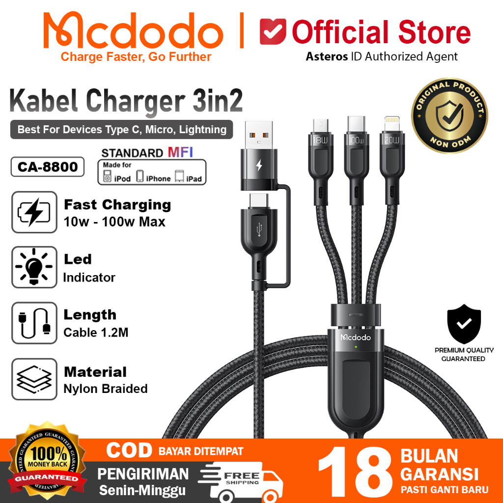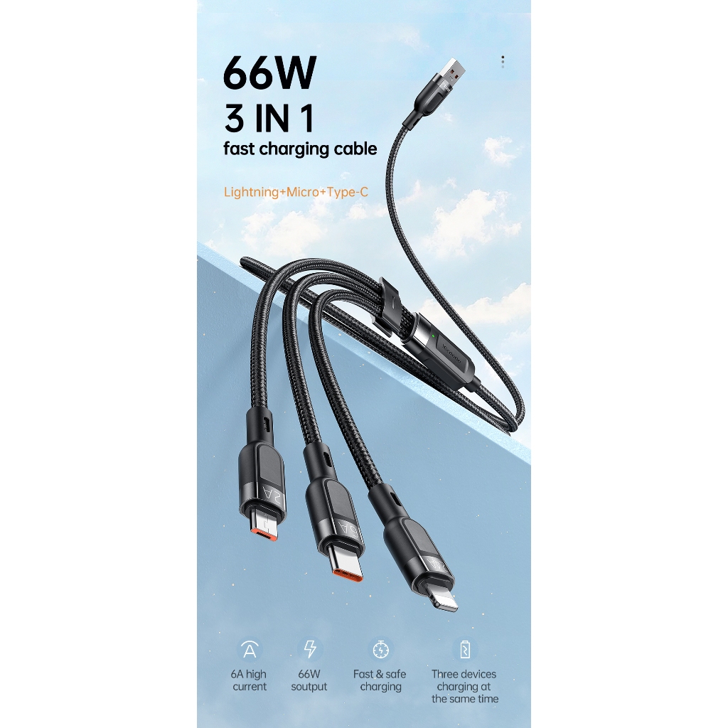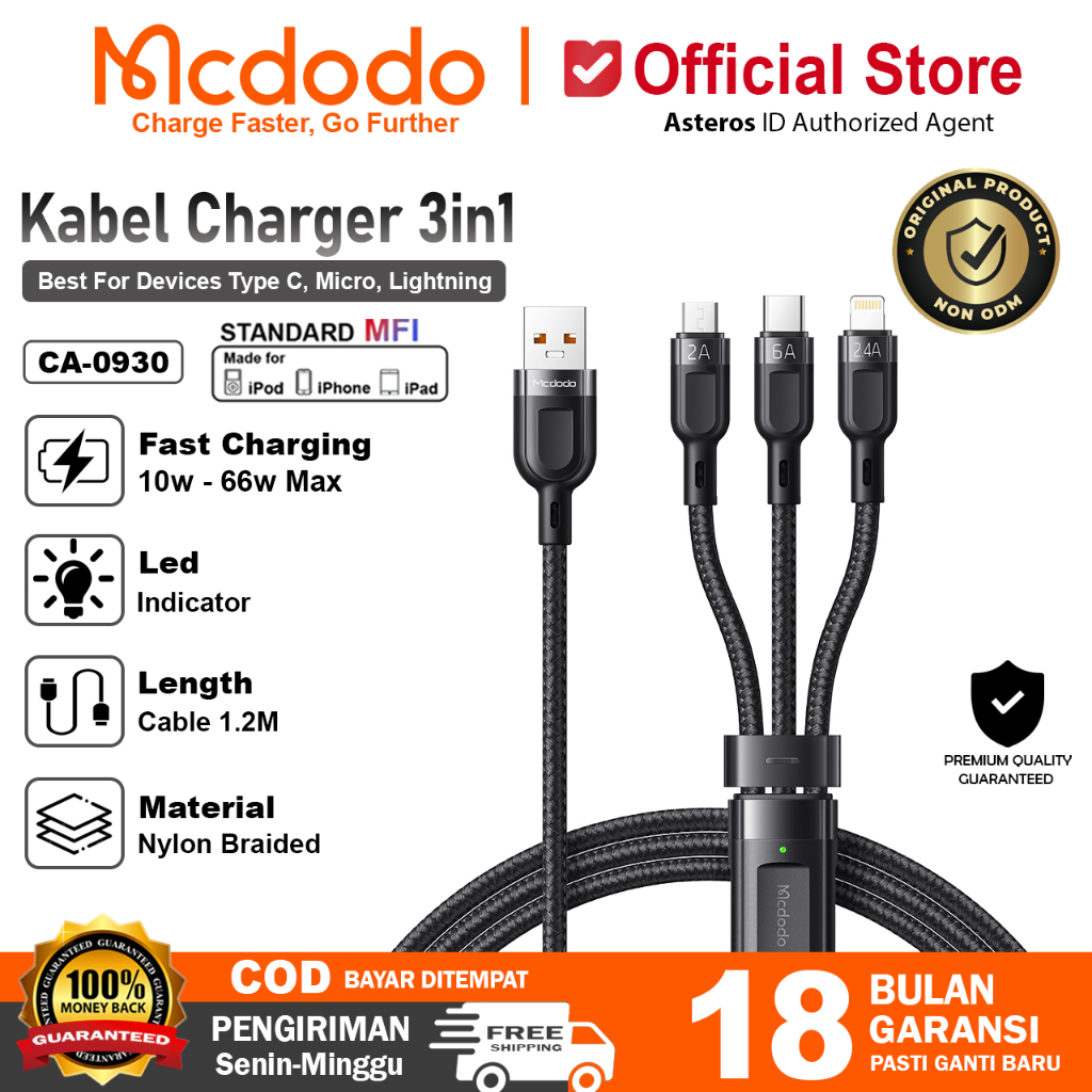 MCDODO Kabel Data 3in 1 Micro USB, Lightning, USB Type C Fast Charging 66W Max CA-0930