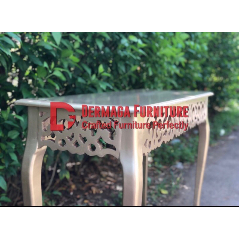 MEJA CATERING TINGGI KAYU MAHONI FINISHING CHAMPANGE MEJA DEKORASI MEJA PELAMINAN DERMAGA FURNITURE JEPARA