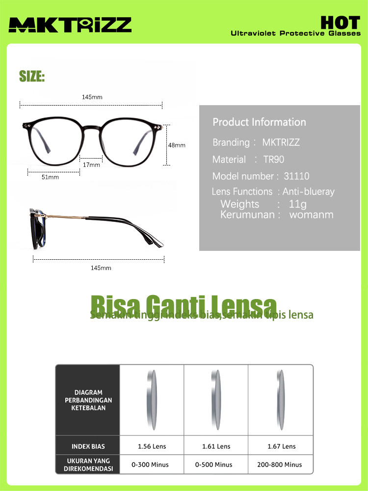 MKTRIZZ Kacamata Anti Radiasi Wanita Anti Blueray Eyeglass Minus Frames Rangka Paduan MZ31110