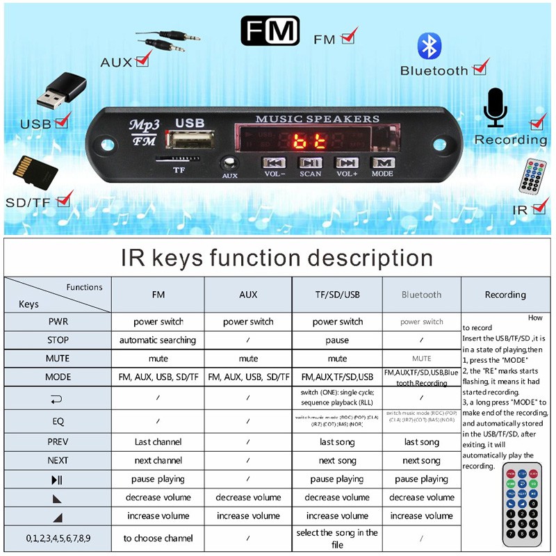 MODUL DECODER MP3 PLAYER USB TF BLUETOOTH FM RADIO 12V RECORD KIT MODUL PAPAN MODUL DECODER MP3