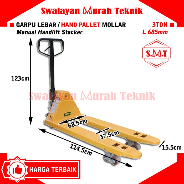 MOLLAR Hand Pallet 3 Ton Garpu 685mm Lebar Manual Handlift Stacker 3Ton