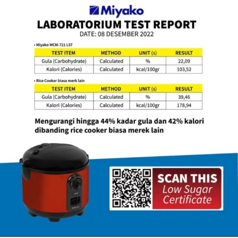 Magicom Miyako Low sugar / Rendah Gula kalori mcm 721 LST 1.8 Liter anti lengket & stainless stell