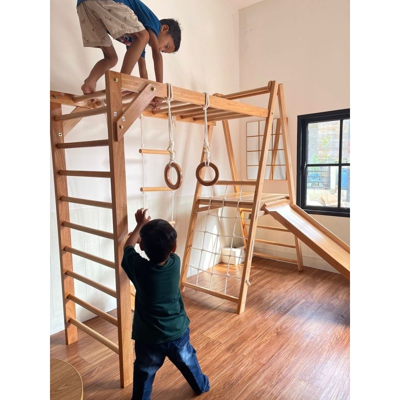 Mainan Anak Playground Ayunan Tangga Tali Rock Climbing Brakiasi Segitiga Kombinasi Kayu Mahoni Kuat Playhouse