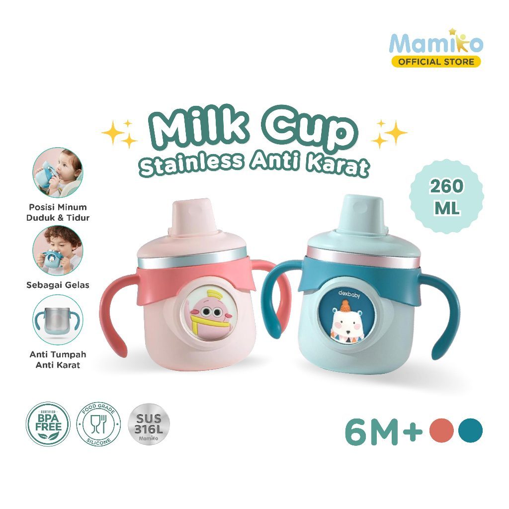 Mamiko Gelas Botol Susu Stainless Bayi Anak 260 ML | Milk Cup Stainless Steel 3in1 Anti Karat | Gelas Susu Bayi Anak Sedot Anti Tumpah | Sippy Cup Stainless 316 | Training Cup Baby Safe Stainless Steel | Termos Susu Tahan Panas 8 Jam