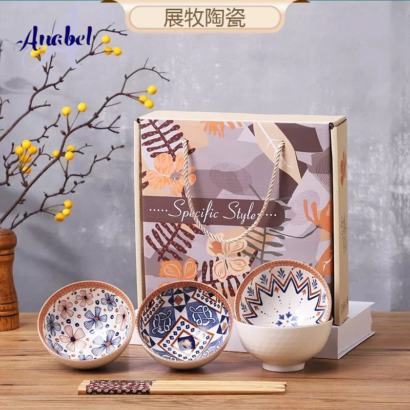 Mangkok Set Japan 4PC Motif Antik Bahan Keramik Plus Paper Bag dan Sumpit 17SS500