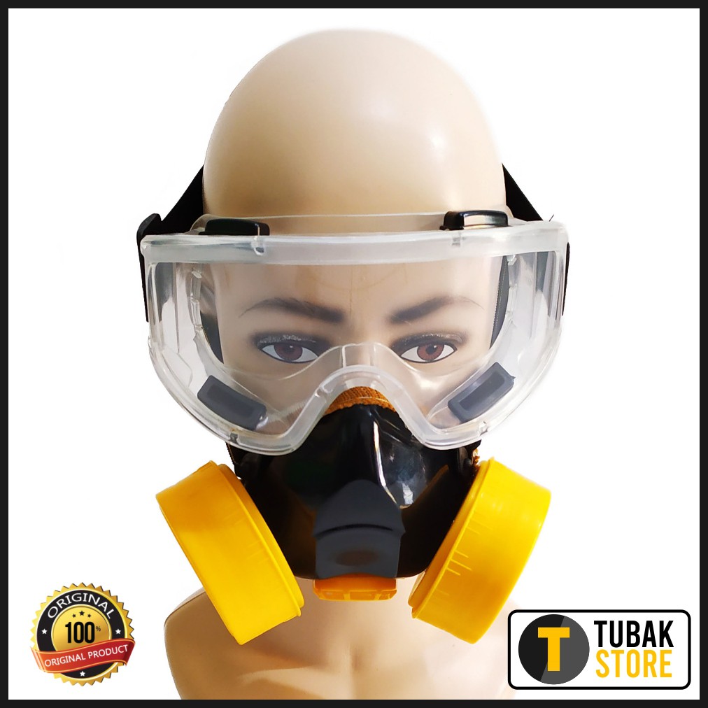 Masker Gas Respirator Double dan Kacamata Goggle Transparan Bening / Masker Kimia / Masker Obat