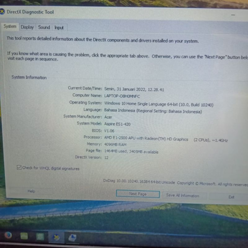 Laptop Acer ES1-420 AMD E1 - 2500 Ram 4Gb/ HDD 500GB Vga AMD Radeon Hd 8240 Layar 14inch