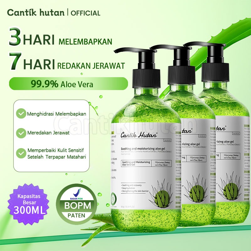 Cantik Hutan Aloe Vera Gel 300ml Original – Gel Lidah Buaya 3in1 Wajah Badan Rambut Brightening Moisturizer Soothing Acne Melembapkan Jerawat Bruntusan Sunburn Hair Mask Rambut Kering Rusak Tanpa Alkohol Aman Sensitif Cepat Meresap Tidak Lengket