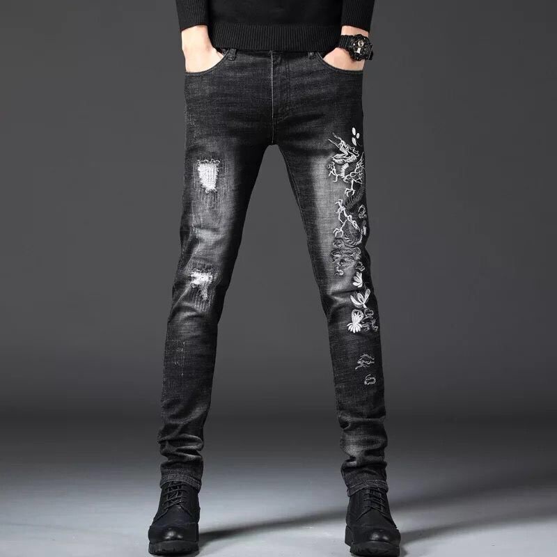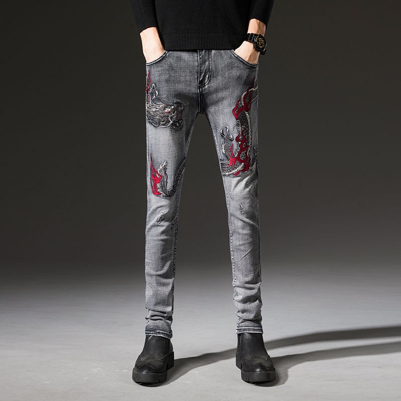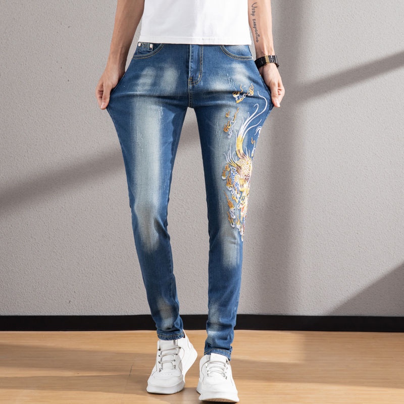 Men's Embroidered Jeans Men's Fashion Elastic Slim Fit Korean Edition Casual Fashion Feet Pants