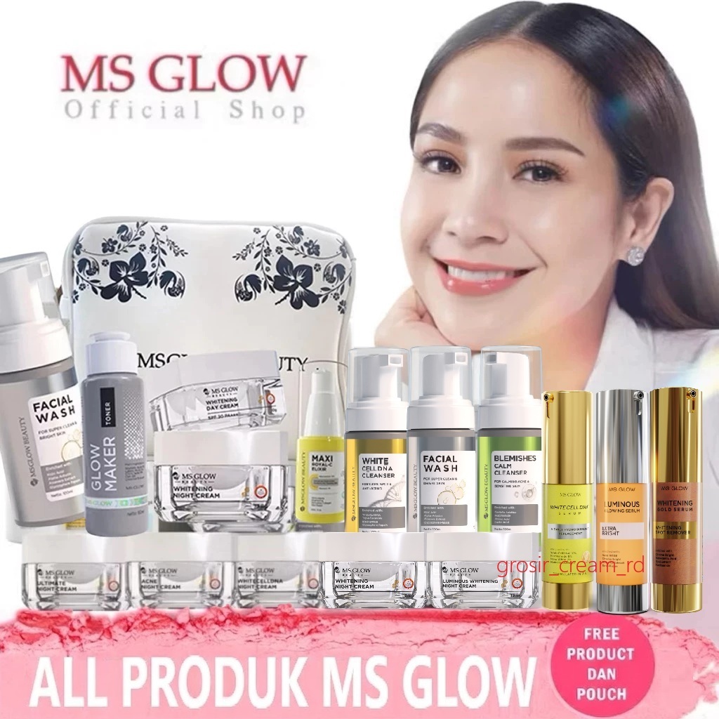 MS GLOW All Produk Paket Wajah Free Pouch | Ecer Whitening Night Cream Luminous Malam Ultimate Krim Siang Facial Wash Toner Acne Glow Maker Sabun Men Pro Day Serum Gold DTE Salmon Mini Cell DNA WCD Blemish Calm Cleanser