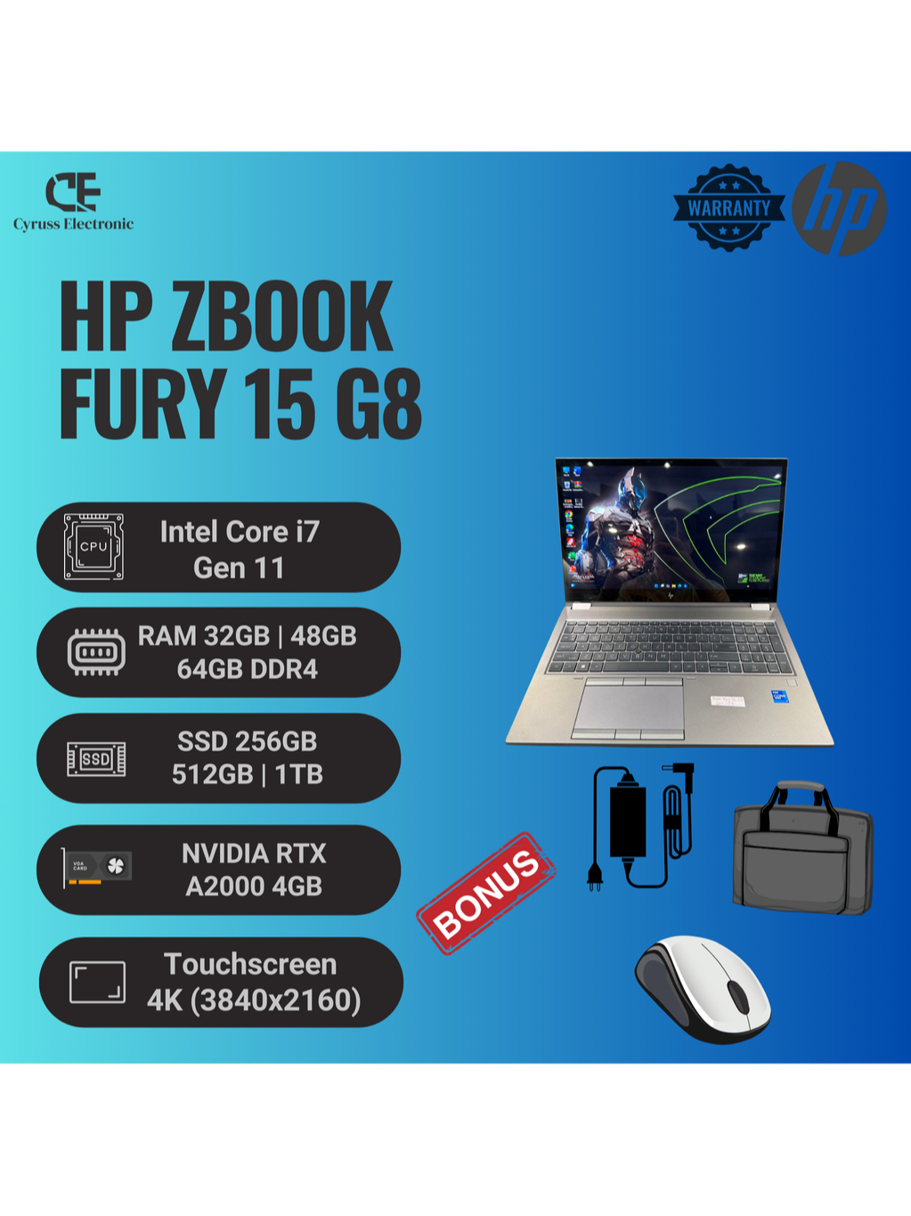 Laptop HP Zbook Fury G8 Core i7 Gen 11 RAM 64GB SSD 1 TB | Layar 15 inch Touchscreen | Second / Bergaransi