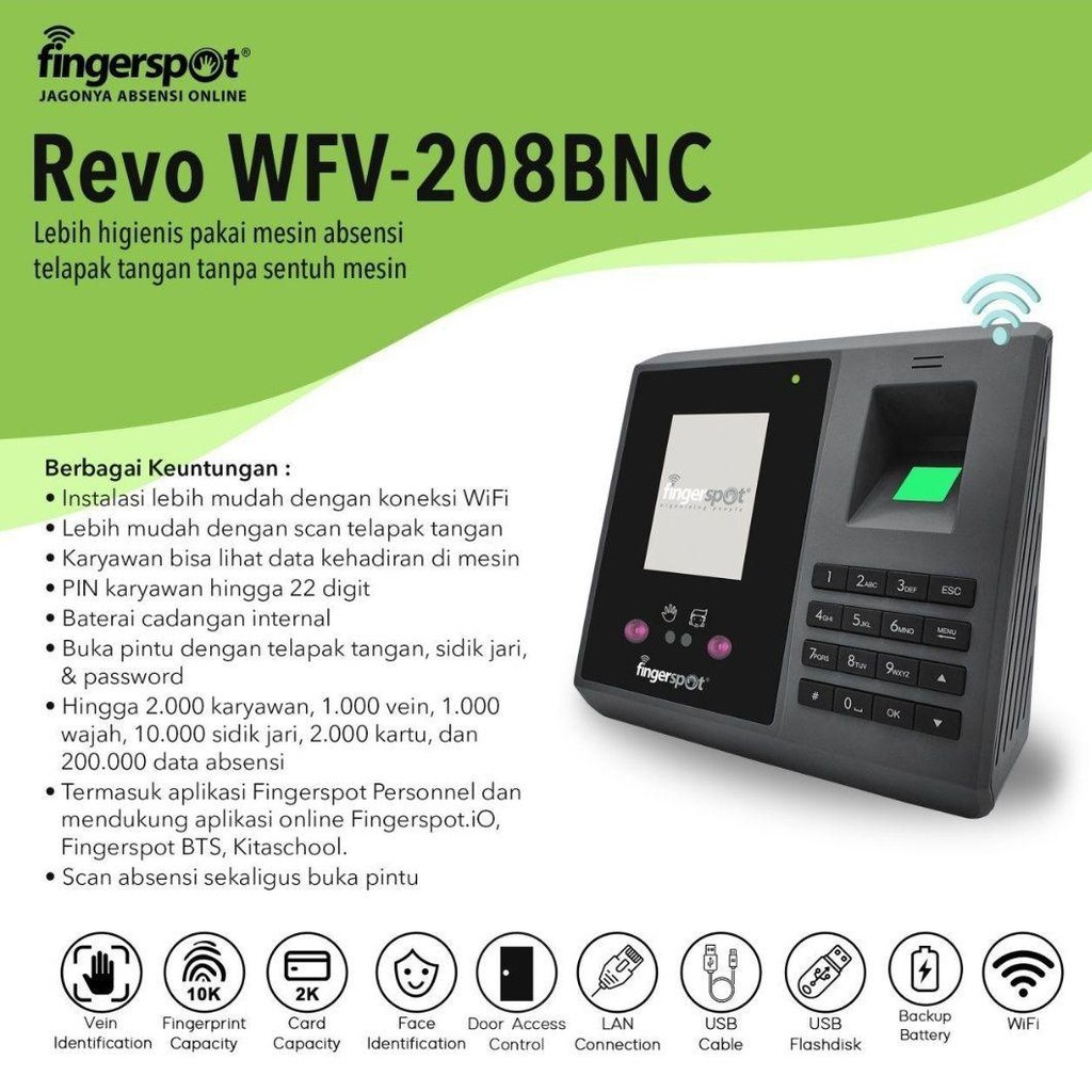 Mesin Absensi Wifi Fingerspot Revo WFV 208BNC scan absen sidikJari Kartu Wajah Telapak Tangan