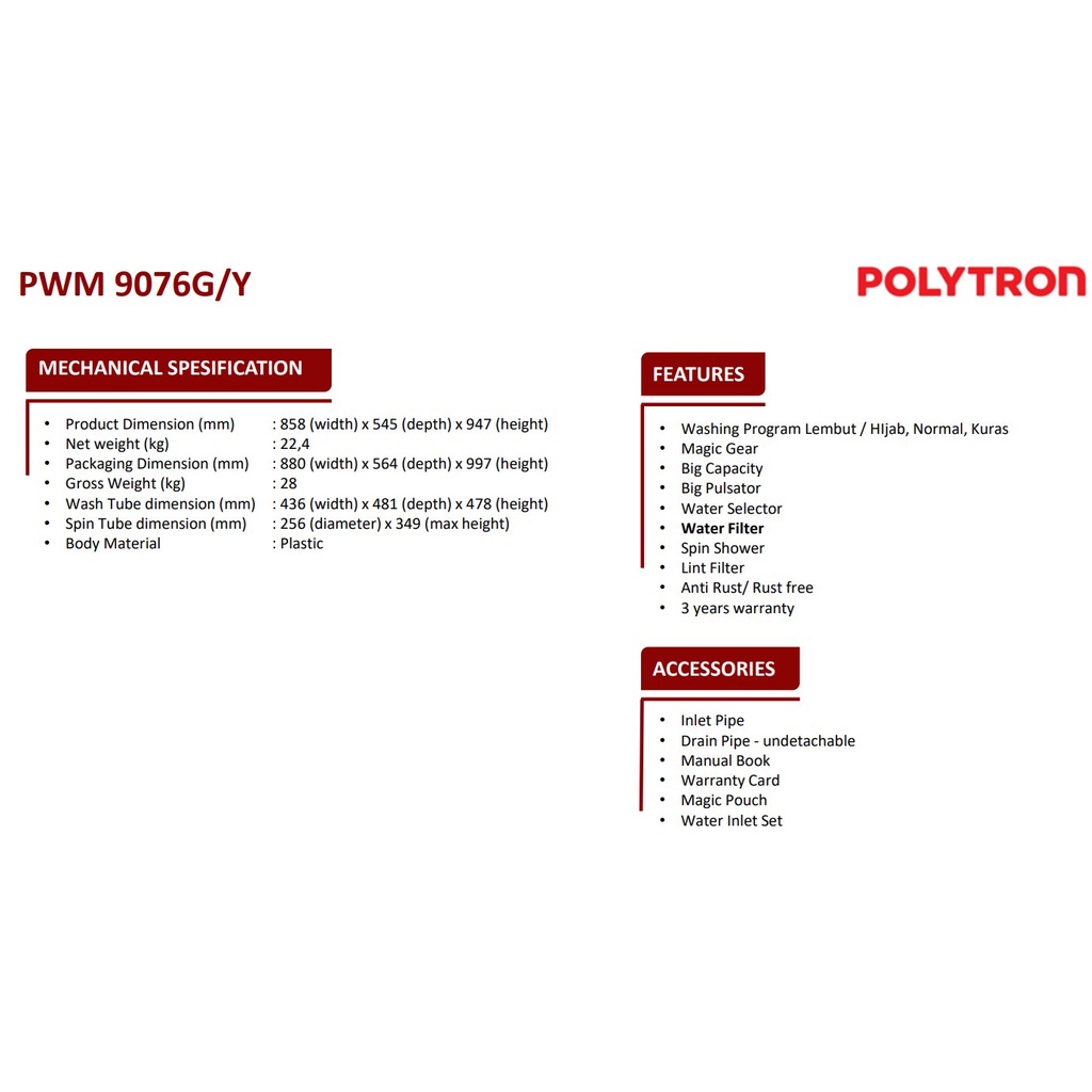 Mesin Cuci 2 Tabung Polytron 9KG PWM 9076