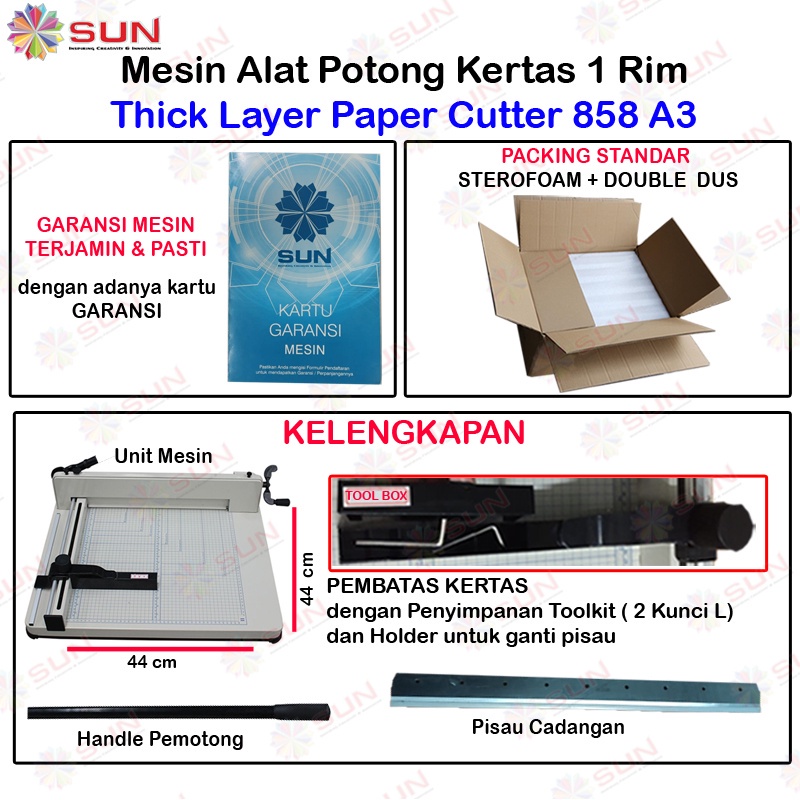 Mesin Pemotong Kertas 1 rim A3 858 Kualitas Super Premium Garansi 2 Tahun ( Alat Potong Kertas / Paper Cutter hvs, Sticker, Art Paper, Undangan, Buku, Brosur Uk A6, A5, A4, F4, A3 )