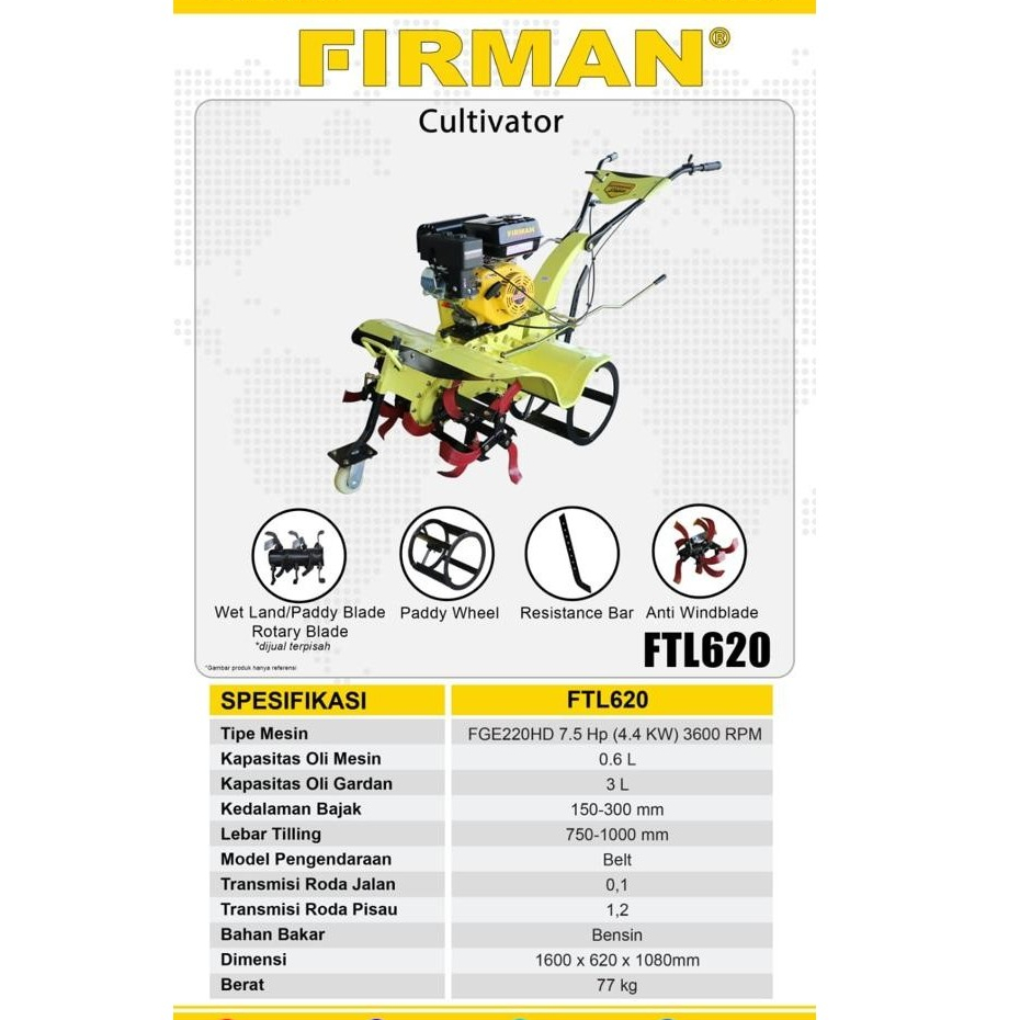 Mesin Traktor Cultivator Mini FTL620 FIRMAN / Mini Tiller Traktor Mini Mesin Bajak Sawah Mini FTL620 ENGINE FGE220HD FIRMAN