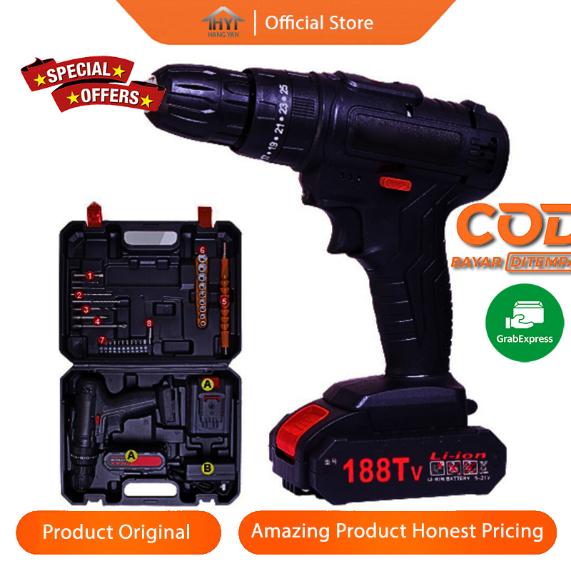 Mesin bor baterai 188 Tv bor baterai cas komplit 10mm Bor cas Mesin Bor Baterai Tangan Cordless Drill Battery Fungsi Bor Cordless bolak balik Dapat Digunakan Pada Kayu Beton, Logam,tembok