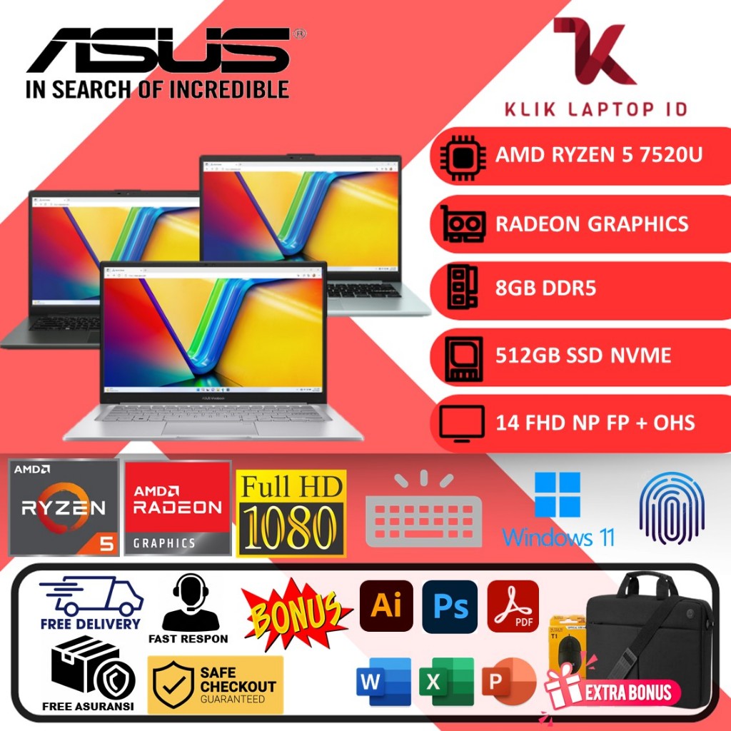 Laptop Gaming Asus Vivobook Go 14 E1404FA Ryzen 5 7520U 8gb 512gb ssd Win11 OHS Garansi 2 Tahun