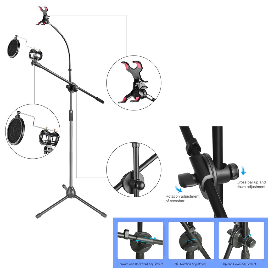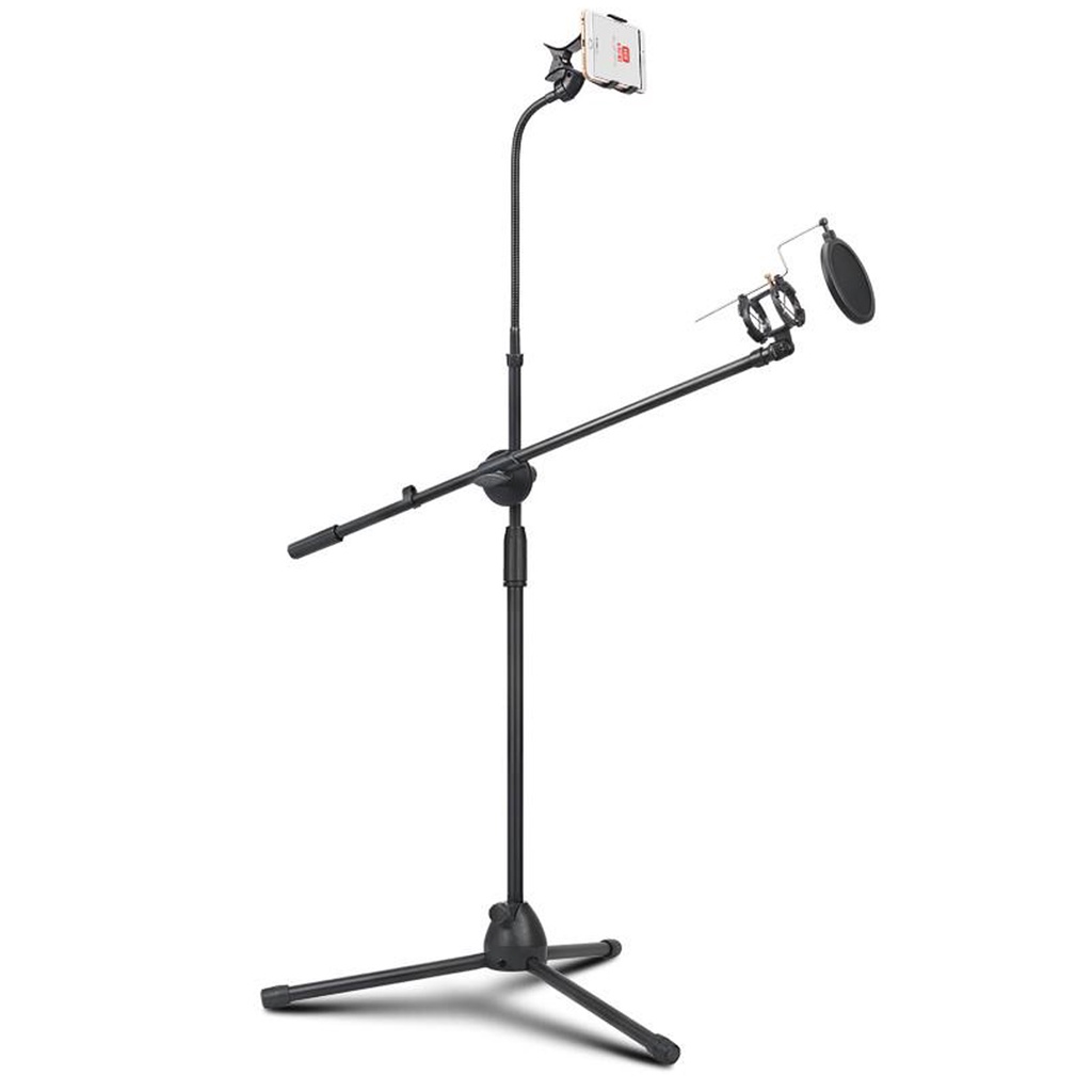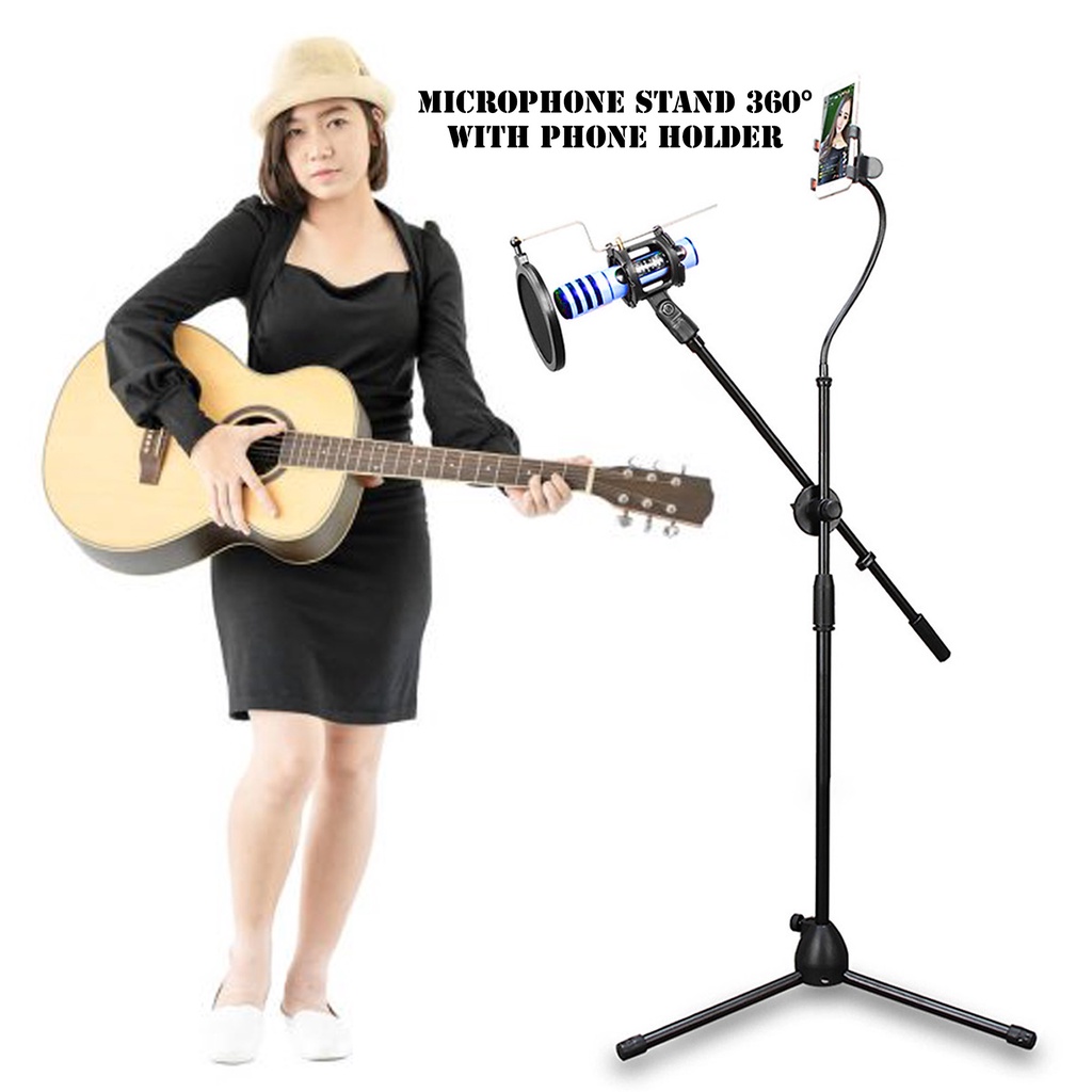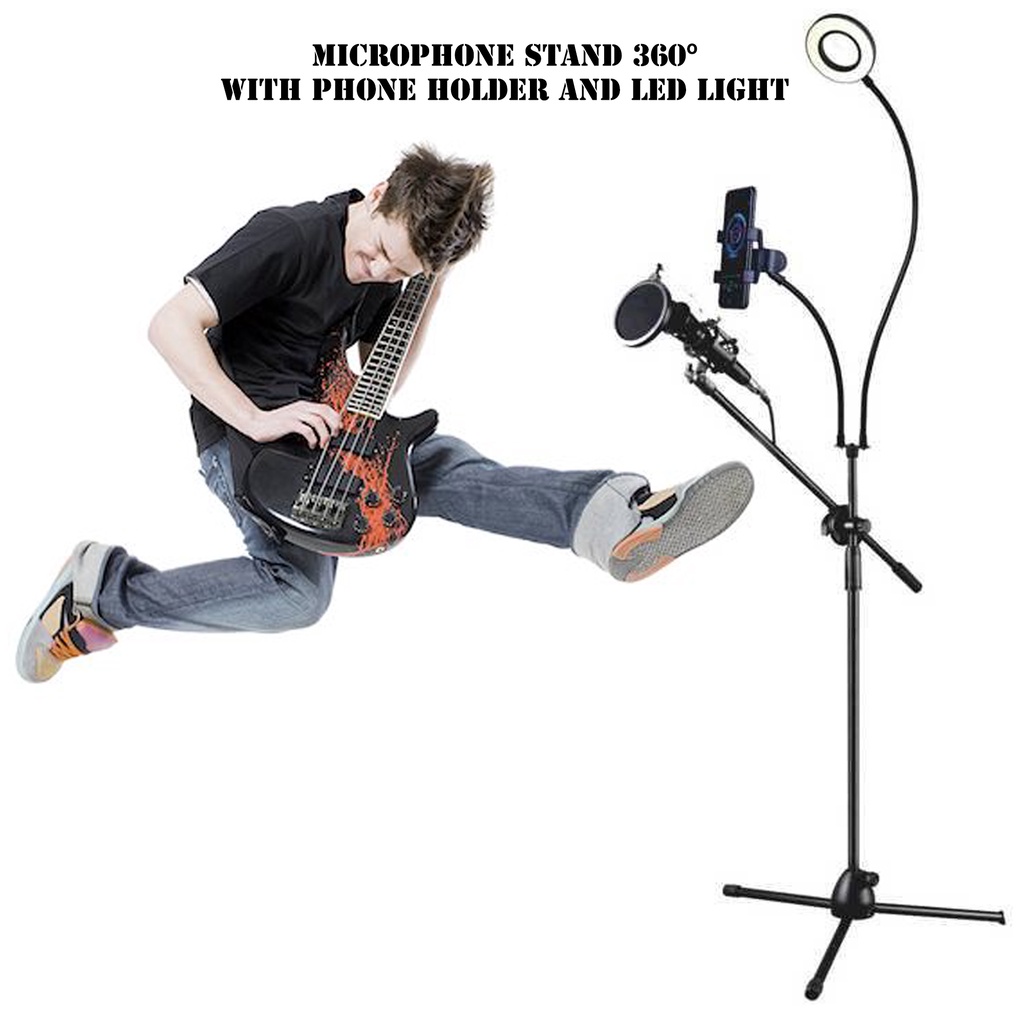 Microphone Stand 360° Dengan Phone Holder & LED Light | Stand Mic Live Streaming, Podcast, Recording