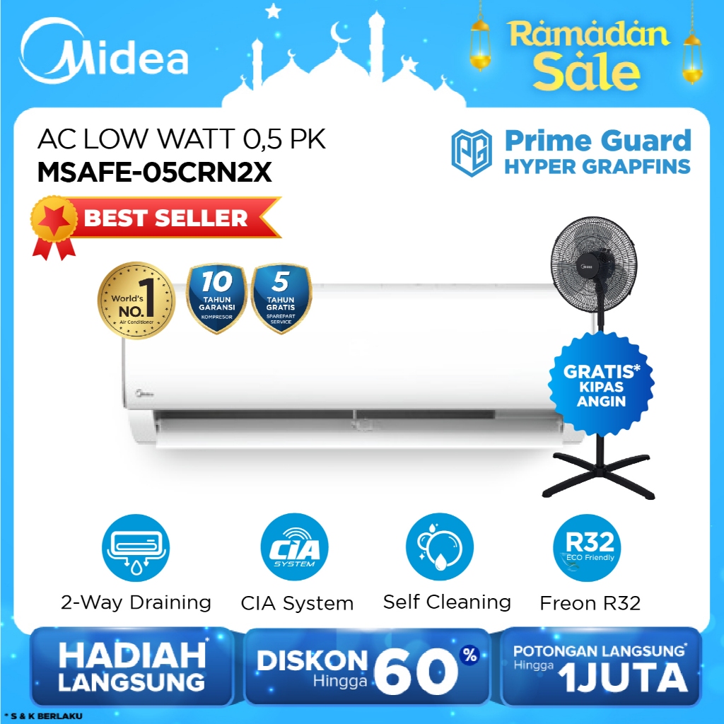 MIDEA AC 1/2 PK STANDARD (0.5 PK) - Fast Cooling Low Watt Anti Bising Turbo Cooling - Hypergrapfins (Unit Indoor & Outdoor Only)