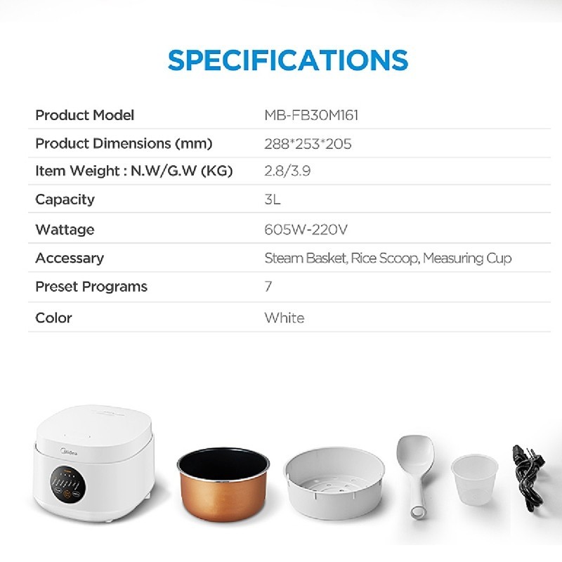 Midea Digital Rice Cooker - MB-FB30M161W - 5 Layer and 7 Preset Menu