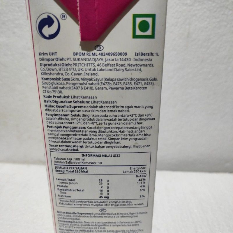 Millac Roselle Supreme Confectionery Topping ( Slightly Sweetened) 1 Liter