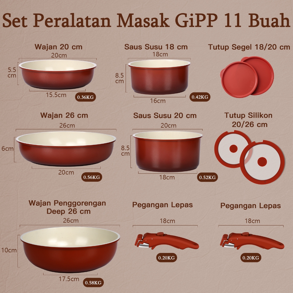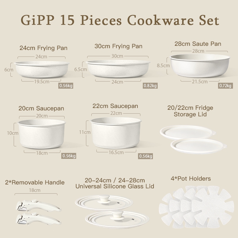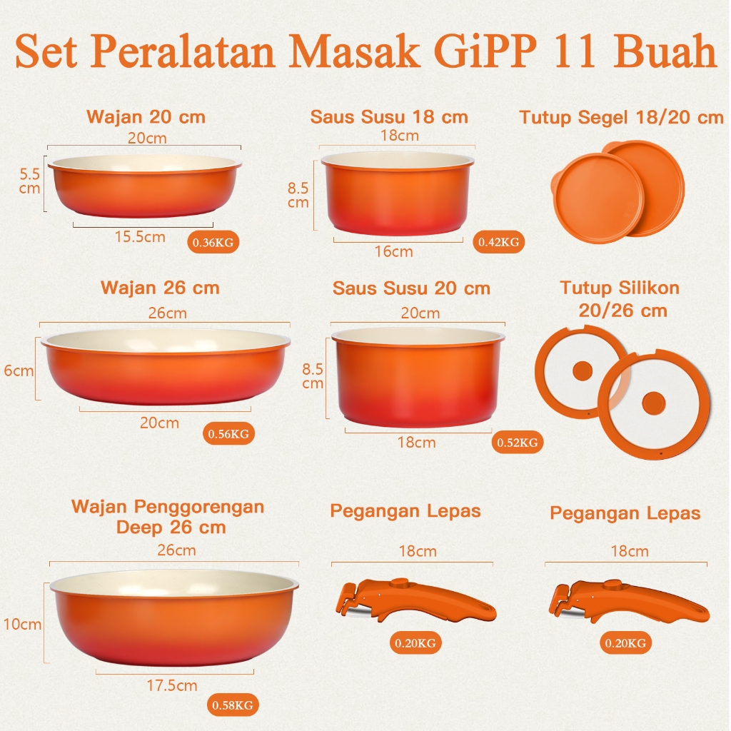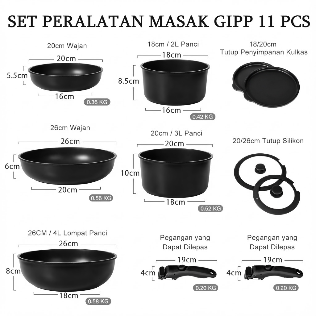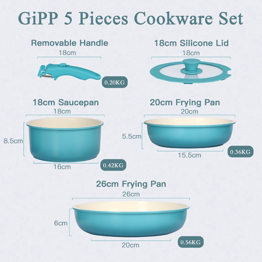 GiPP 3/5/11pcs Removable Handle Cookware Set - Nonstick Wok Pan & Pots Bebas PFAS & PTFE & PFOA