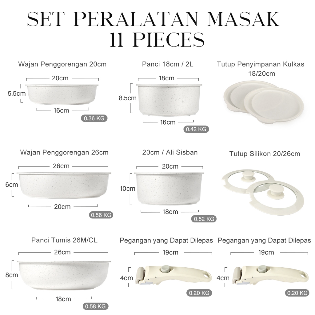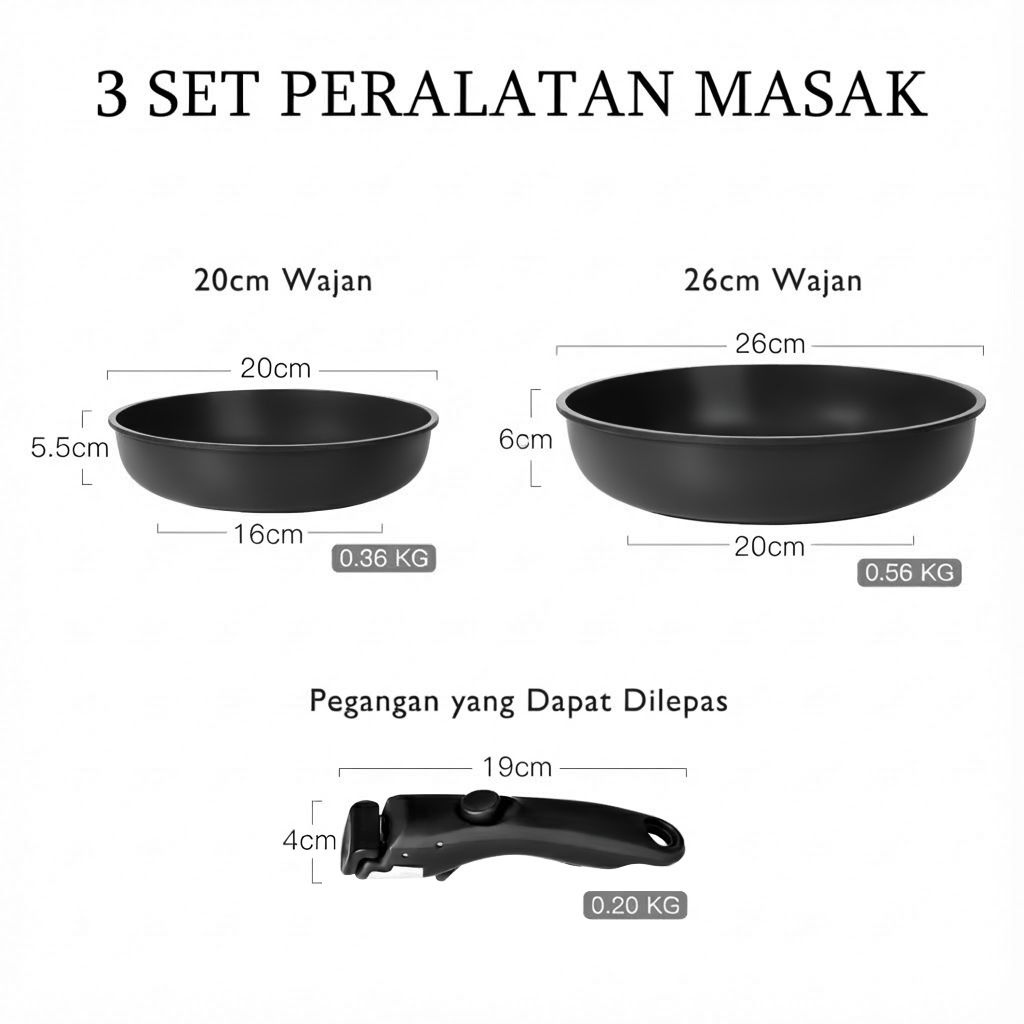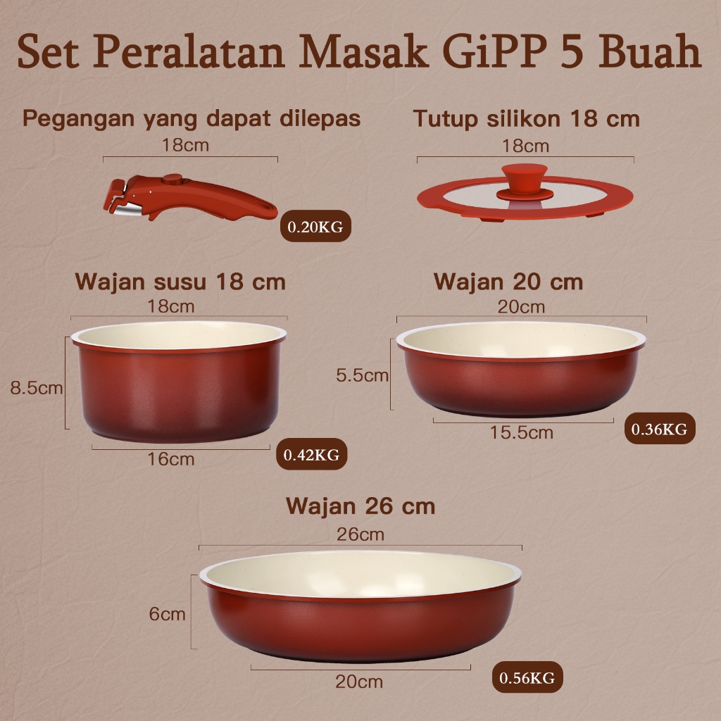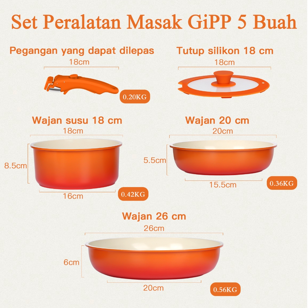 GiPP 3/5/11pcs Removable Handle Cookware Set - Nonstick Wok Pan & Pots Bebas PFAS & PTFE & PFOA