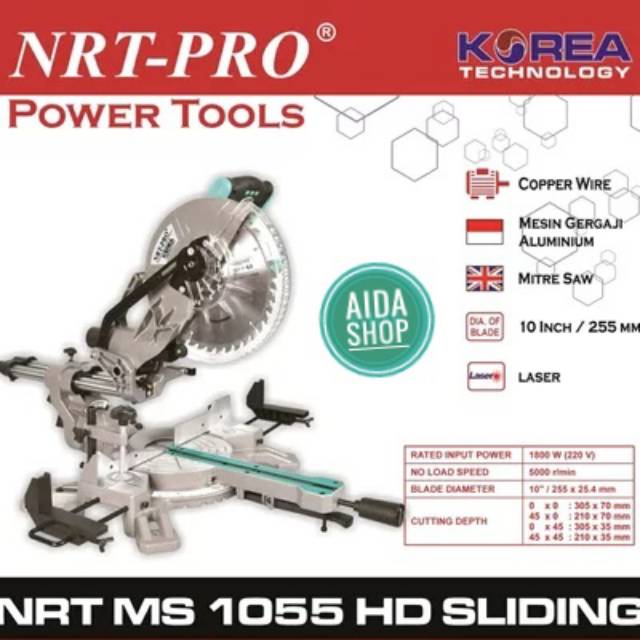 Mitter Saw 10 Inch NRT-PRO MS 1055 HD Mitre Miter Gergaji Aluminium Sliding Mesin MS1055 10" Sliding Mitter Saw 10 Inch Miter Saw Sliding 10" Laser Mesin Gergaji Potong Kayu 10" Almini Besi Mitersaw 10