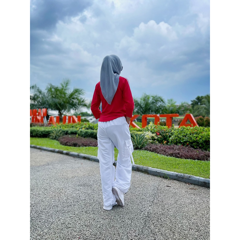 Mix Match Cargo Harajuku Putih Bahan Parasut dan Atasan N Petir Merah Lis Putih Bahan Spandek Unisex Bisa dibeli Satu Stel dan Pembelian Terpisah
