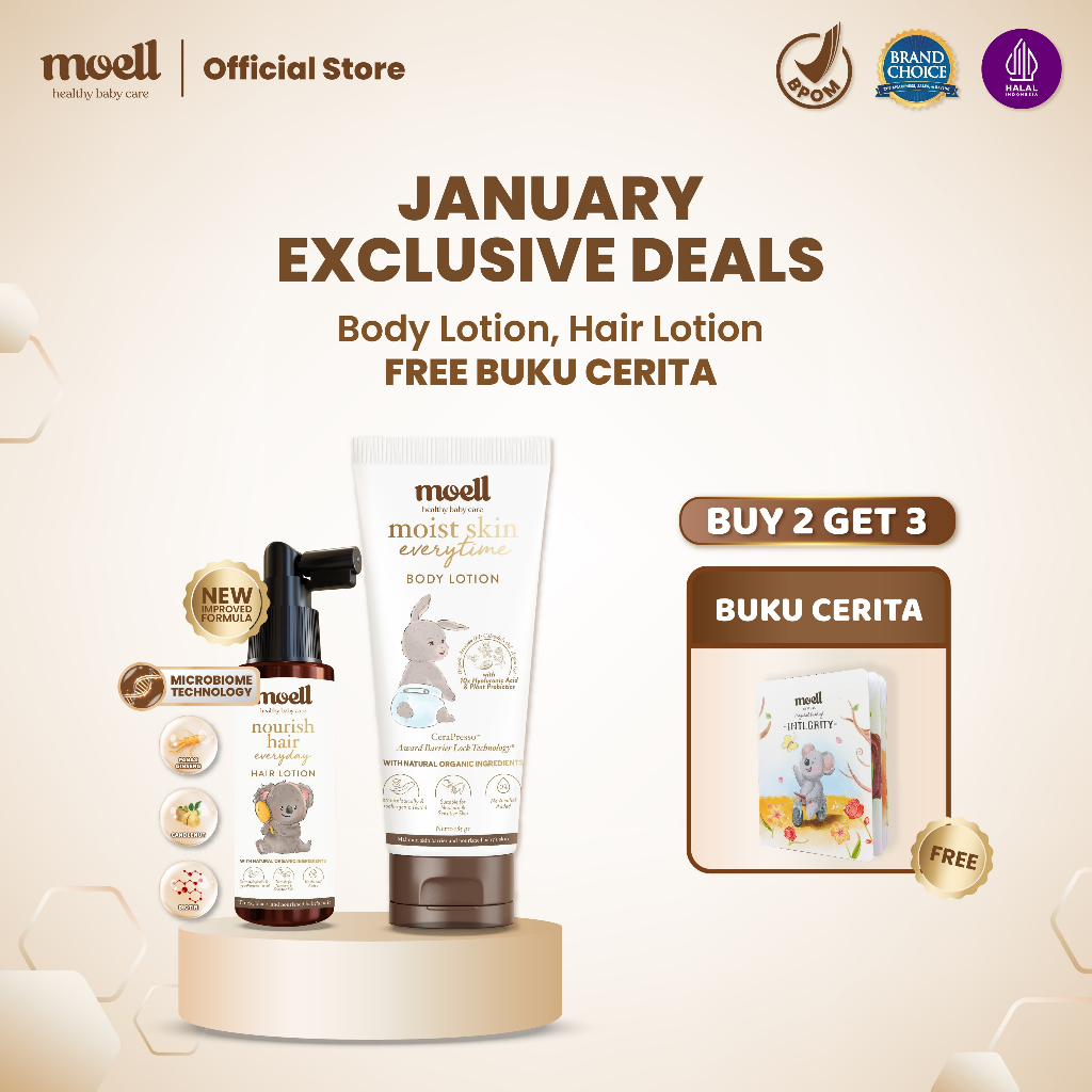 Moell Hair & Skin Combo Bundling Body Lotion 185gr & Hair Lotion 100gr - Perawatan Badan & Rambut Bayi Anak Formulasi Dokter - Hair Lotion dengan Panax Ginseng, Candlenut Oil, Biotin - Skincare Bayi - Skincare Anak