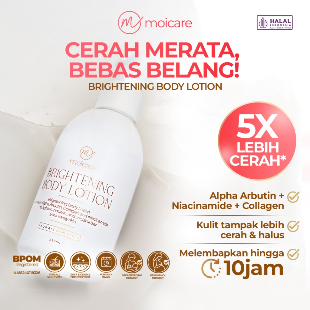 Moicare Brightening Body Lotion - Pencerah Kulit Kusam, Melembutkan, Menghaluskan, Memudarkan Noda Hitam, Melembapkan Kulit Kering with Niacinamide, Alpha Arbutin & Collagen
