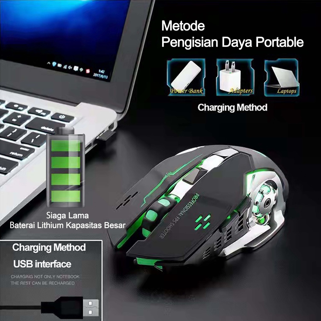 Mouse Gaming Isi Ulang 2400 DPI Nirkabel Ultra Slim Diam Bisu Lampu LED Komputer Laptop Isi Ulang Mouse Nirkabel Bluetooth Mouse Gowy