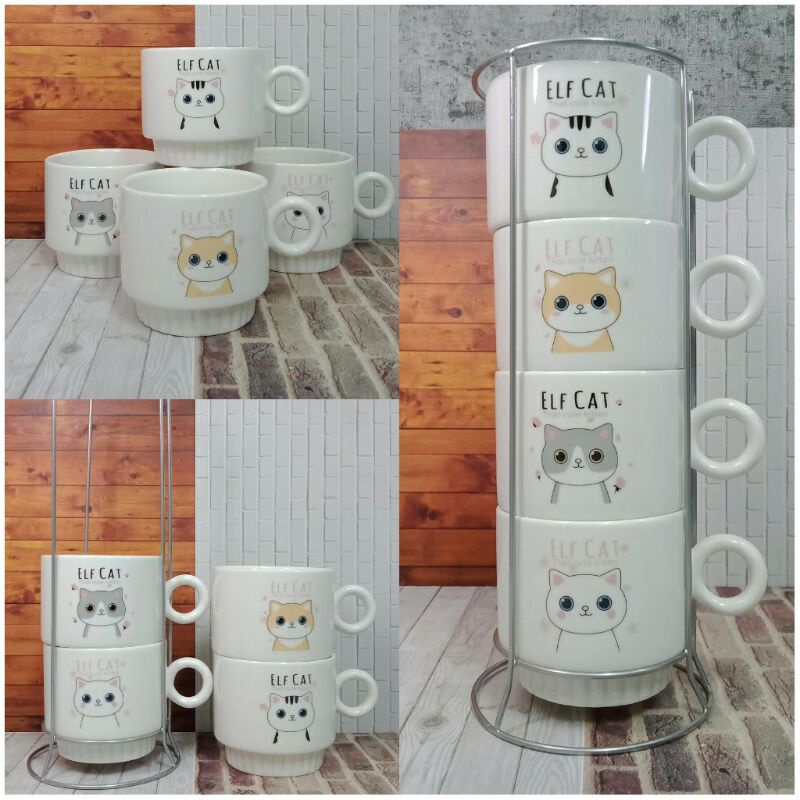Mug / Gelas / Cangkir / Cup Air / Gelas Kopi / Gelas Teh / Gelas Susu / Cangkir Kopi / Cangkir Teh / Cangkir Susu / Coffee Cup / Tea Cup / Gelas Set / Mug Rak Keramik Susun 4 Large Kucing Love Buah Paris Smile Emoticon Animal Doraemon Pohon Eiffel Jeruk