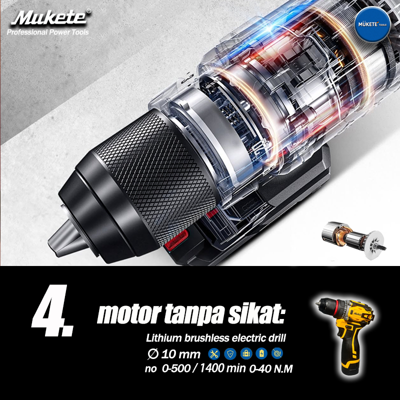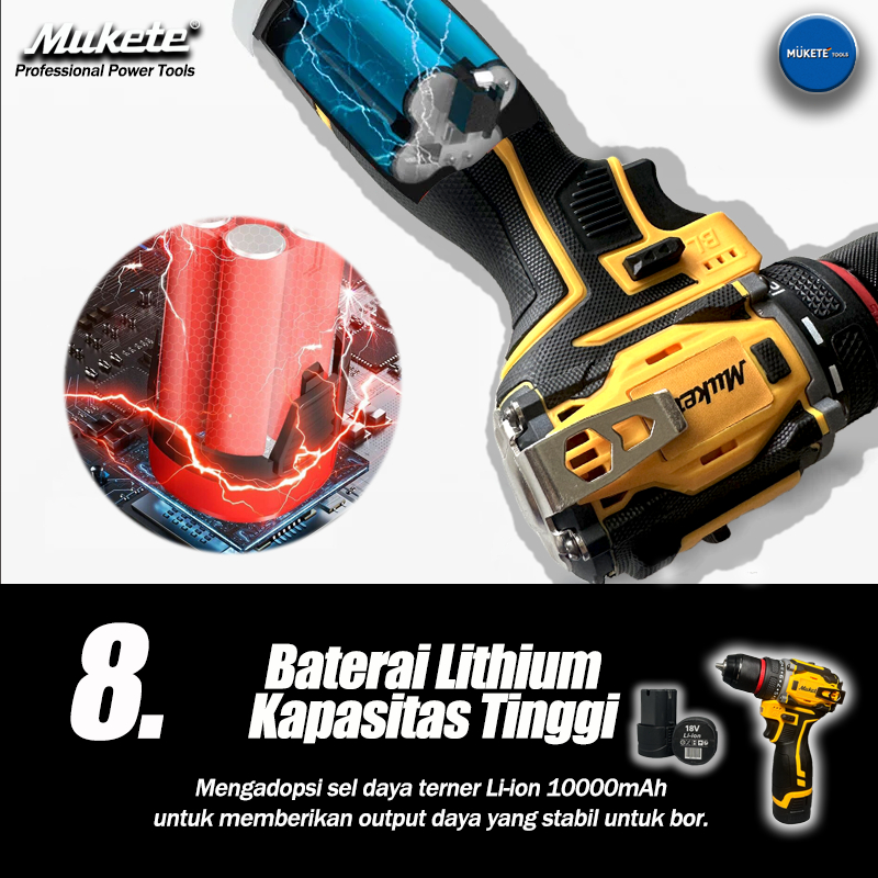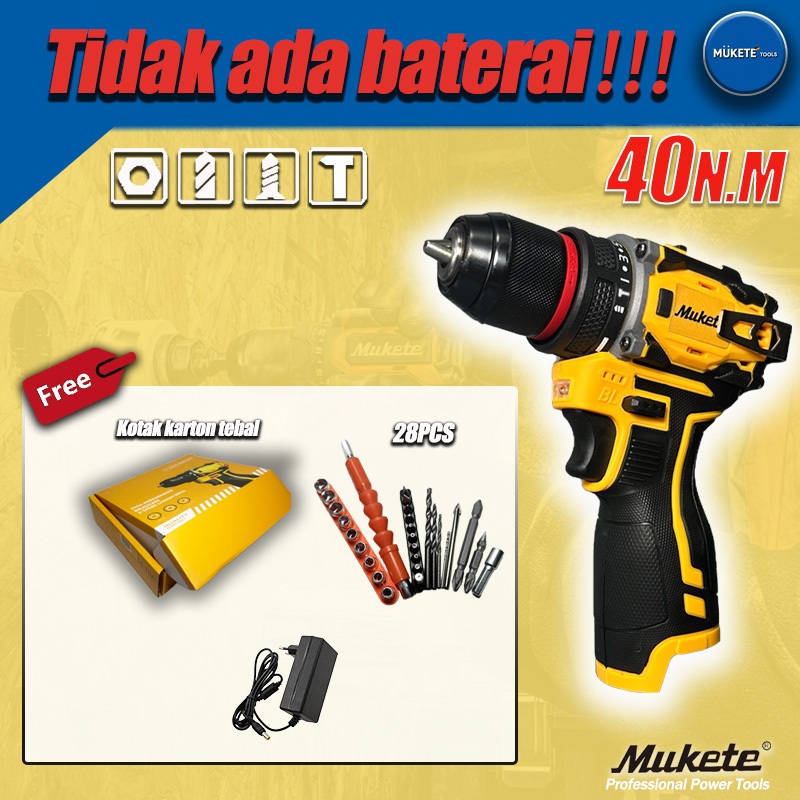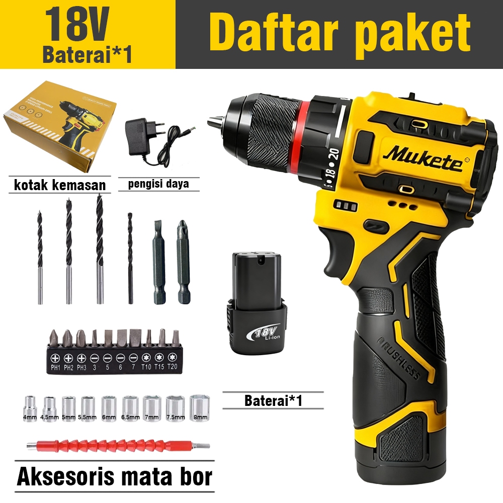 Mukete bor brushless 18V bor baterai 40N.m 0-500/0-1400r/menit bor cordless bor impact baterai