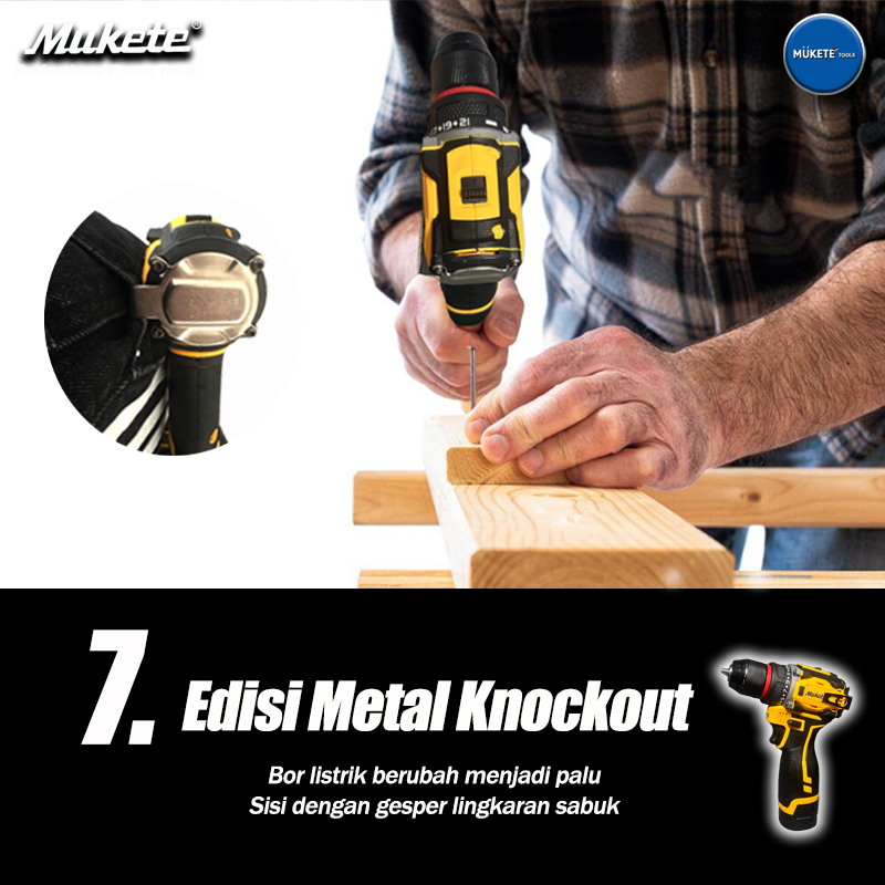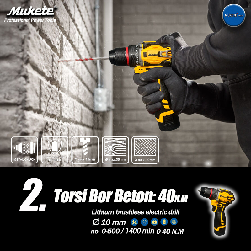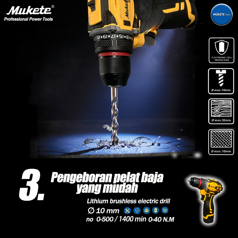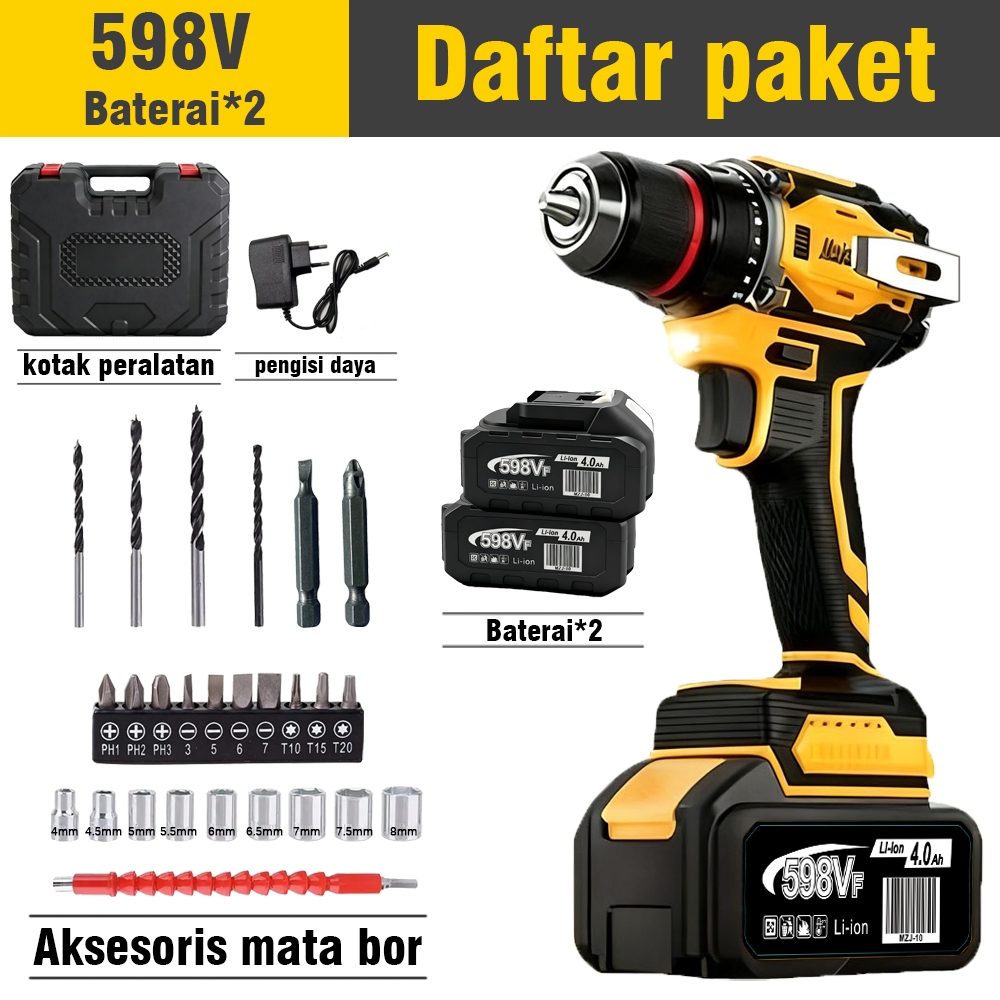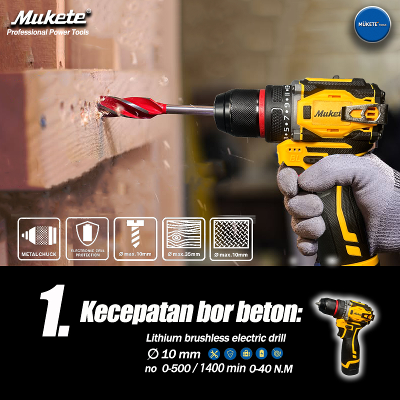 Mukete bor brushless 18V bor baterai 40N.m 0-500/0-1400r/menit bor cordless bor impact baterai