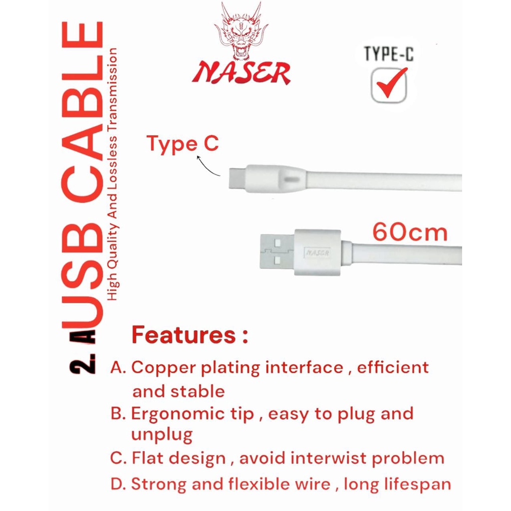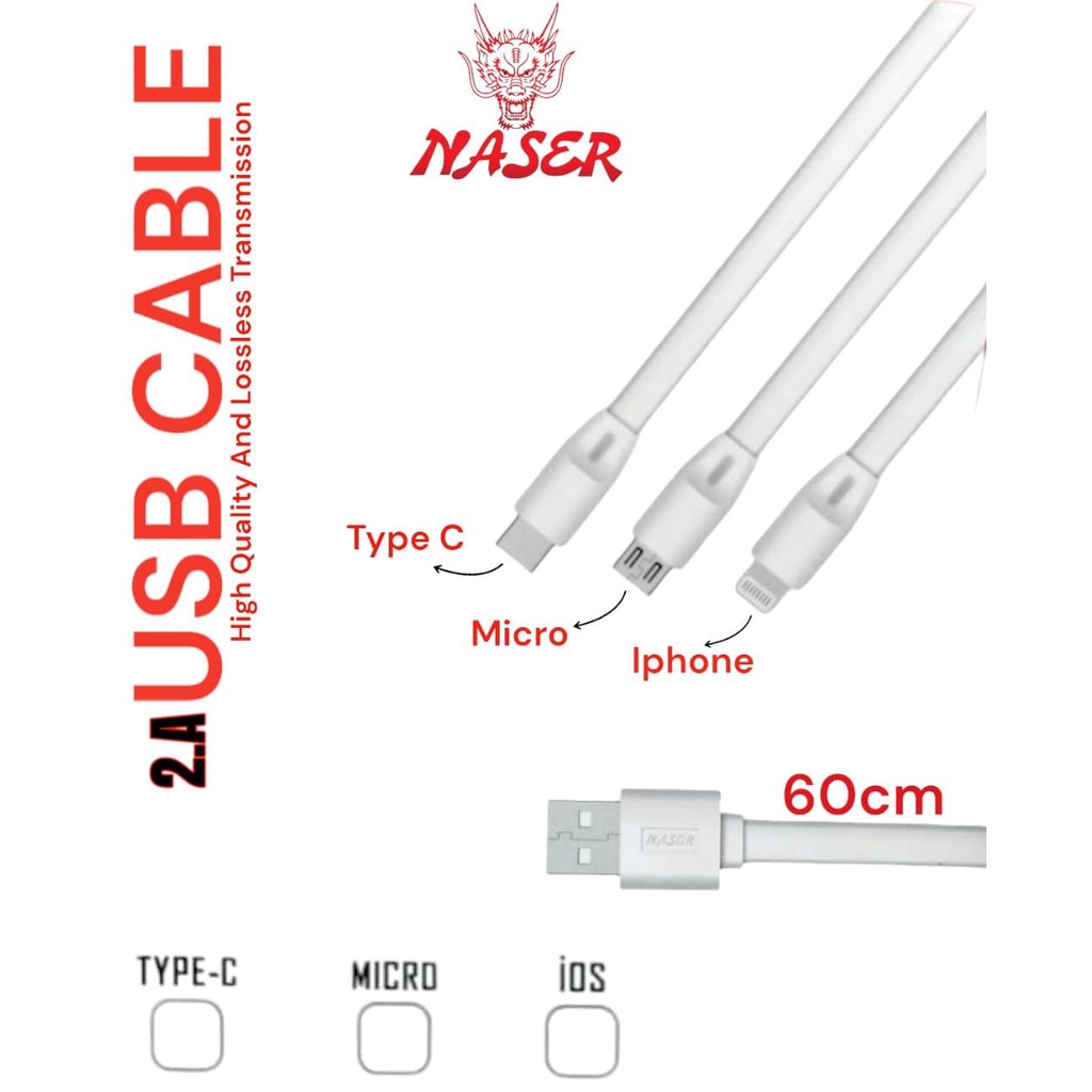 NASER KABEL DATA CHARGER 60CM / Usb Cable Micro / Type C / Iph / Kabel Data Gepeng 2.1A 60cm