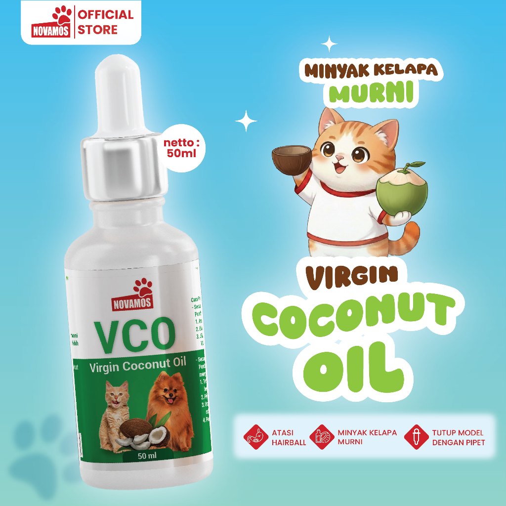 NOVAMOS Minyak VCO Kucing VCO Kucing Jamur dan Bulu Rontok Vitamin E untuk Imun, Kesehatan Kulit & Pencernaan Sehat Anabul - VCO 50 ml