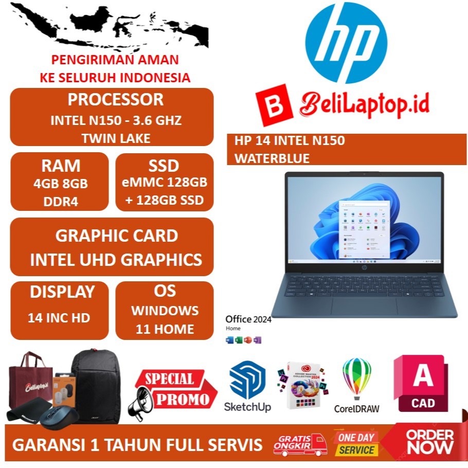 LAPTOP BARU HP 14 INTEL N150 RAM 8GB SSD 256GB 14.0 WIN11HOME ORIGINAL + OFFICE SIAP PAKAI