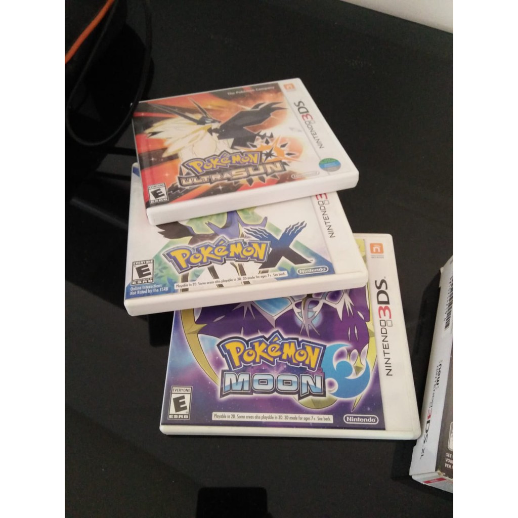 New Nintendo 3ds XL (C Stick) dengan kaset pokemon ultrasun, pokemon x, dan pokemon moon
